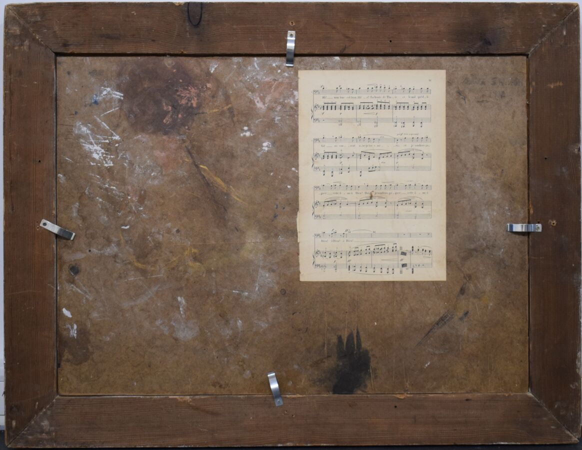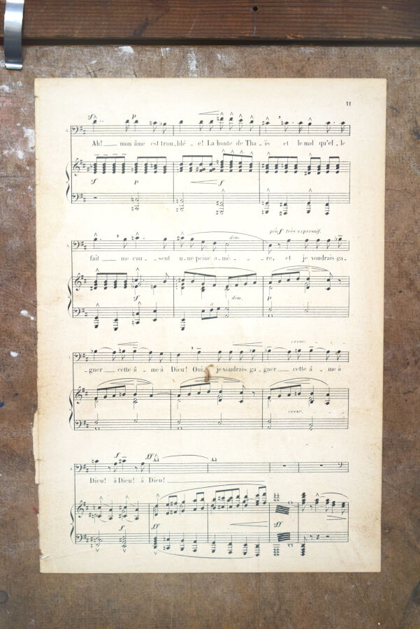 Au verso du support, un extrait de Thaïs de 1894, opéra de Jules Massenet, agit comme un arrière-plan symbolique. L'opéra raconte le destin de Thaïs, courtisane scandaleuse et fascinante, que le moine Athanaël veut sauver par la foi, avant d'être lui-même consumé par le désir qu'il croyait dominer.
