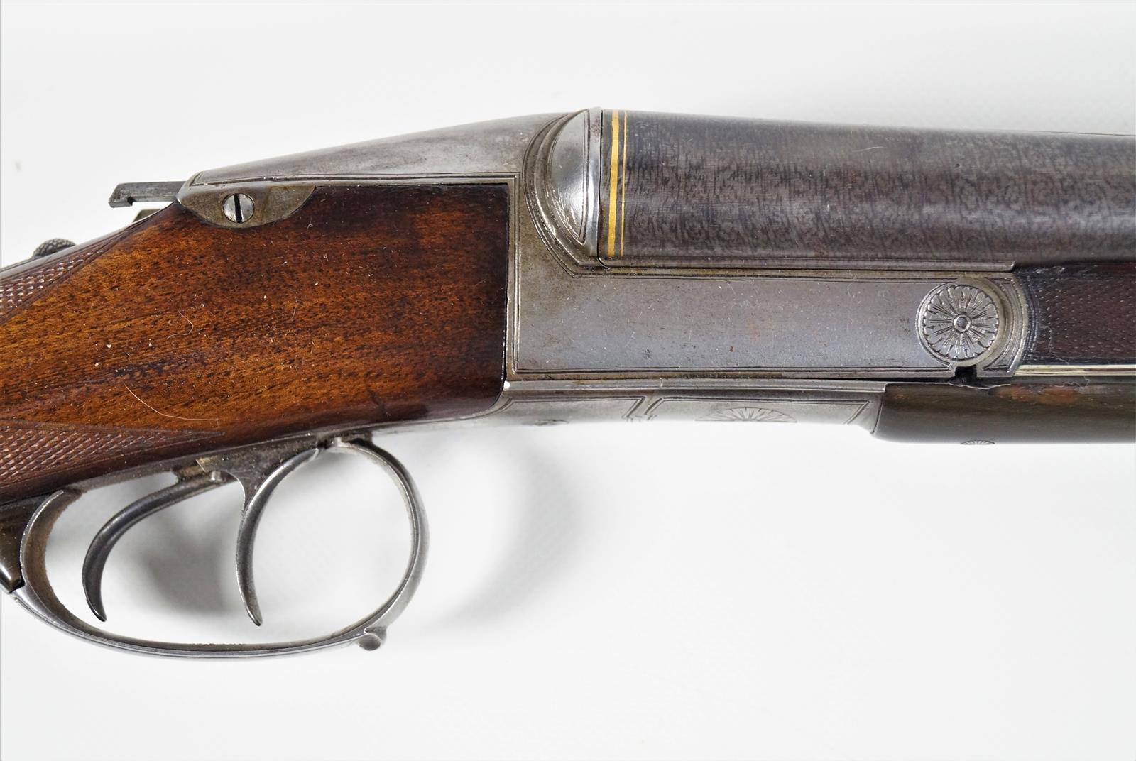 Ancien FUSIL DE CHASSE ALLEMAND DE MARQUE F. W. KESSLER, calibre 16/65 à canons damassés juxtaposés de 74 cm, extracteurs, clé d'ouverture et repose main en corne brune, crosse anglaise en noyer de 32 cm en partie quadrillée, arme numéro 11377, catégorie C soumise à déclaration, mécanisme semblant fonctionnel, canons probablement en bon état (traces de poudre), BE.