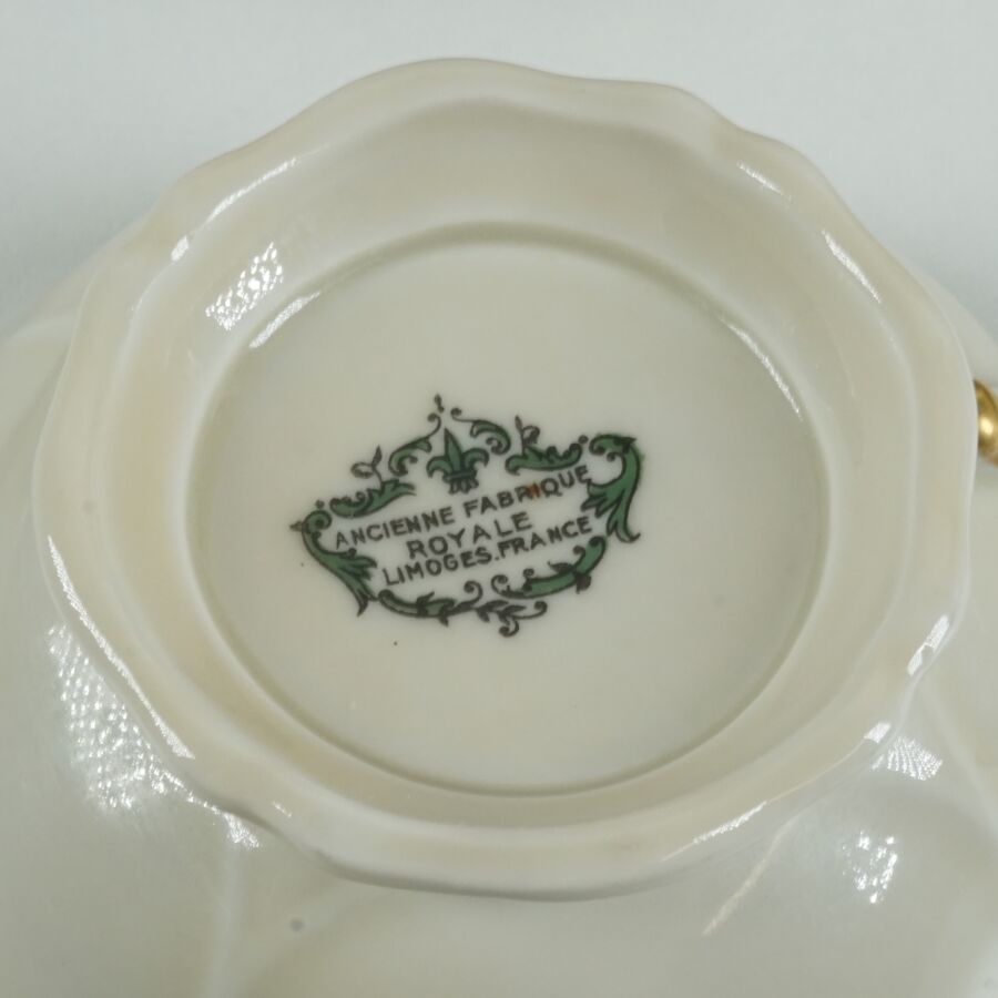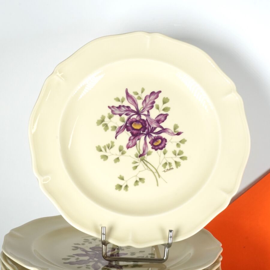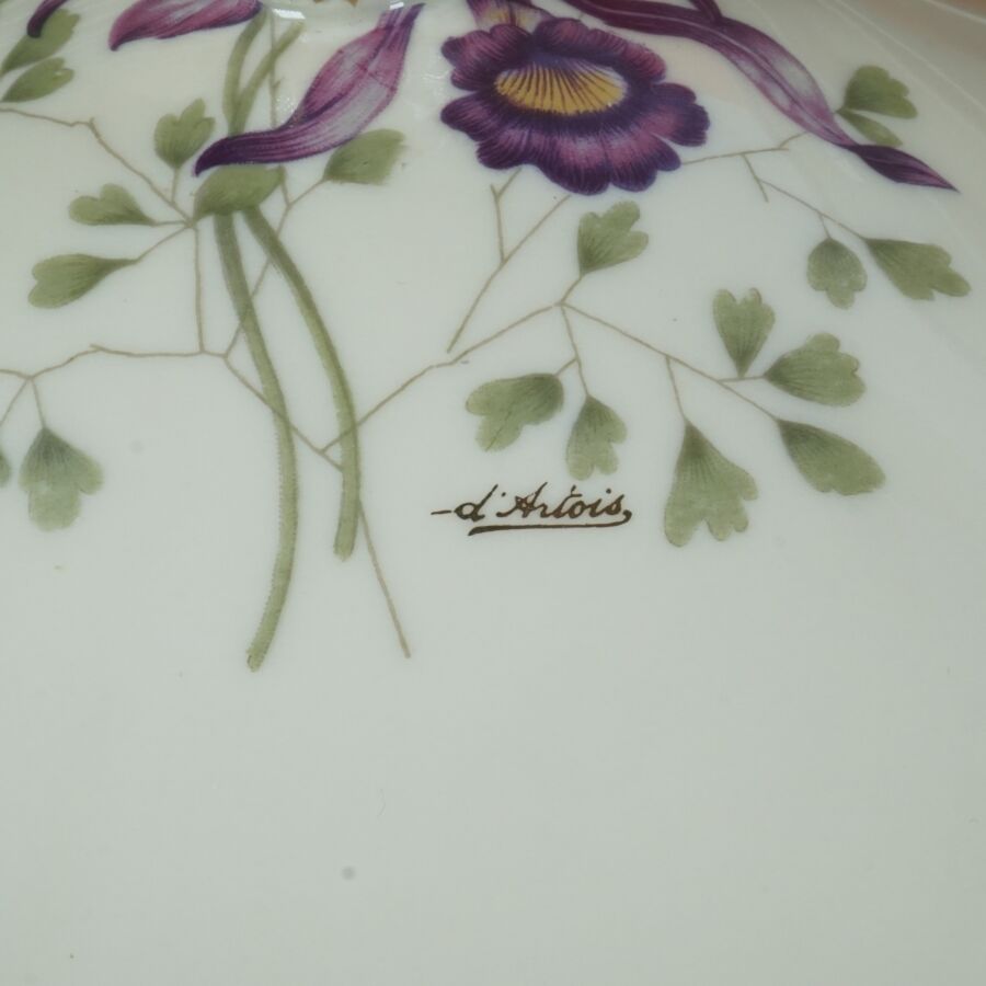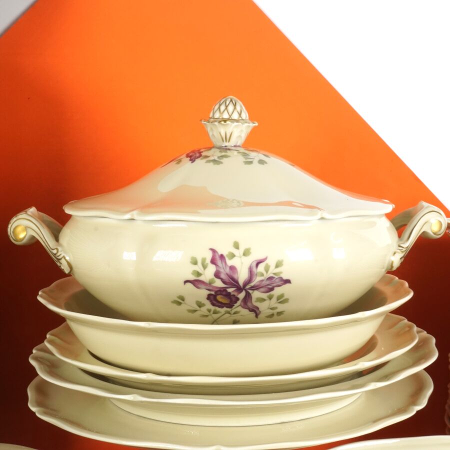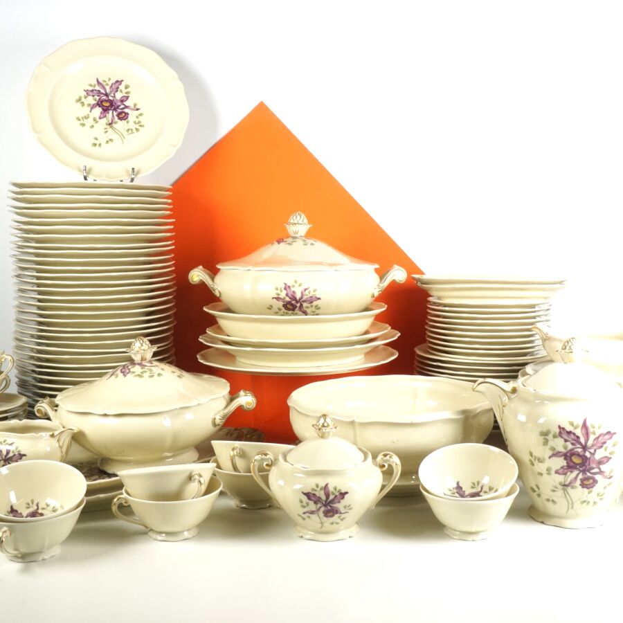 ANCIENNE FABRIQUE ROYALE - LIMOGES : Service de table en porcelaine émaillée polychrome et rehauts d'or à décor floral signé d'Artois sur fond beige céladon, comprenant 2 raviers,1 saucière, 2 plats ovales, 2 plats ronds, 1 plat creux, 1 soupière, 1 légumier, 1 compotier, 1 présentoir, 36 assiettes plates, 12 assiettes creuses, 12 assiettes à dessert, 10 petites assiettes, 12 tasses et leurs sous-tasses, 1 verseuse, 1 sucrier, 1 pot à lait et un plateau, marqué dessous (légères usures).