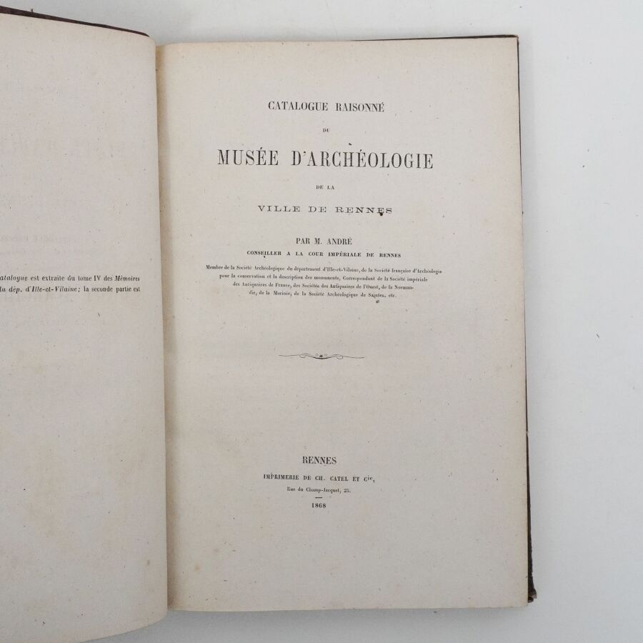 ANDRÉ (Auguste). Catalogue raisonné du musée d'archéologie de la ville de Rennes. Rennes, Catel et Cie, 1868. In-8 demi-veau rouge, dos lisse fileté or, titre doré (reliure de l'époque). Qqs frottés.