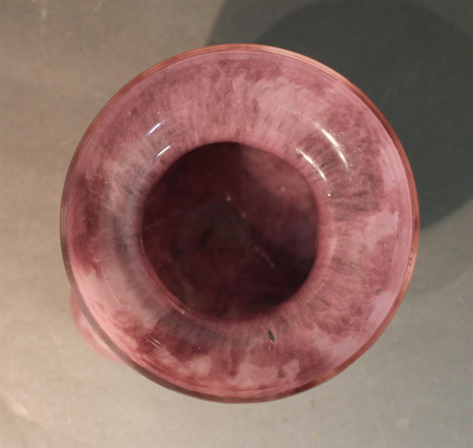 André DELATTE (c.1887-1953) : Vase globulaire à col évasé, en verre mauve moucheté, monture en fer forgé, signé sur le col, H. 13 cm