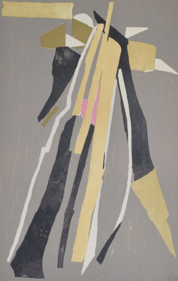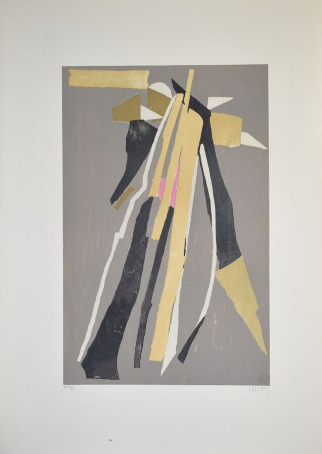 André LANSKOY (1902-1976), "Composition noir et or", lithographie, signée en bas à droite dans la marge, numérotée en bas à gauche, 43.8 x 67.8 cm (pliure légère dans la marge)
