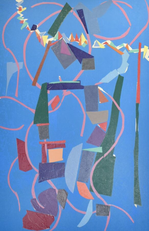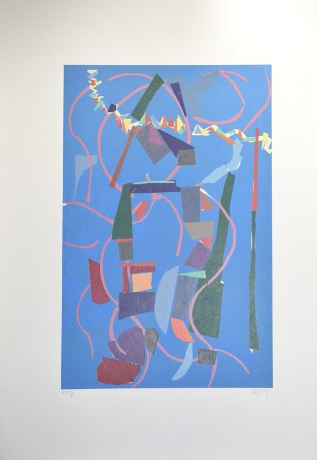André LANSKOY (1902-1976), "Composition sur fond bleu", lithographie, signée en bas à droite dans la marge, numérotée en bas à gauche, 43.8 x 67.8 cm (légère tâche d'humidité)