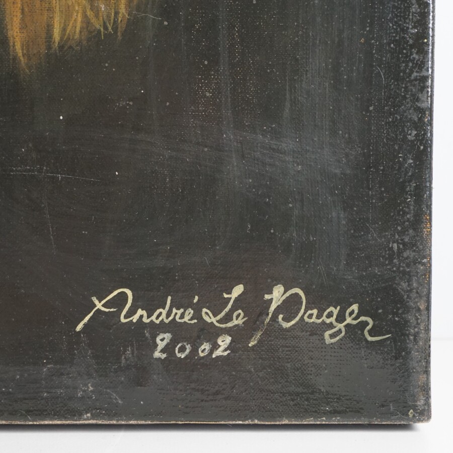 André LE PAGE (1931-2019), "Nature morte au champagne et au violon" 2002, huile sur toile signée et datée en bas à droite, 80 x 80 cm.