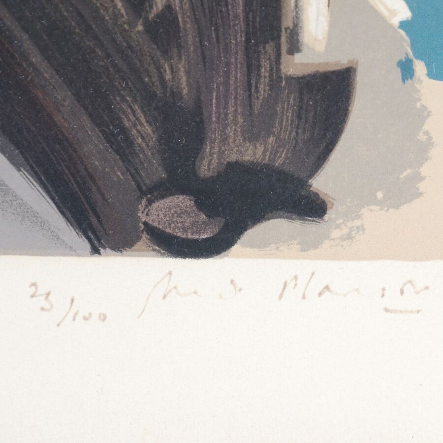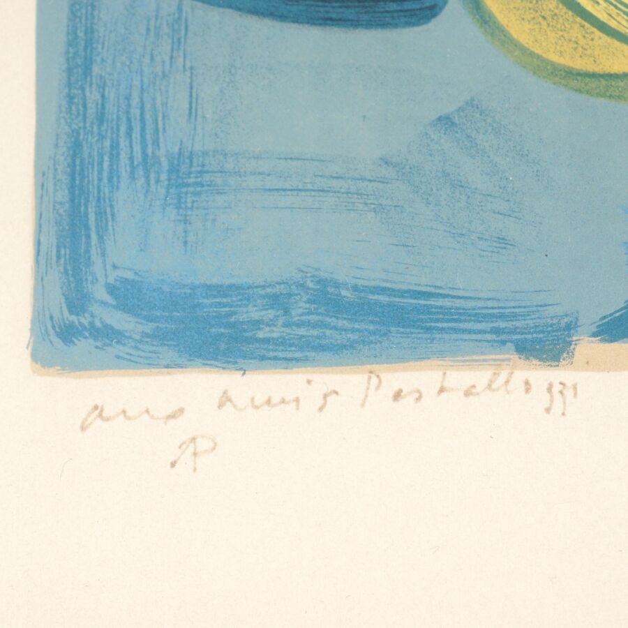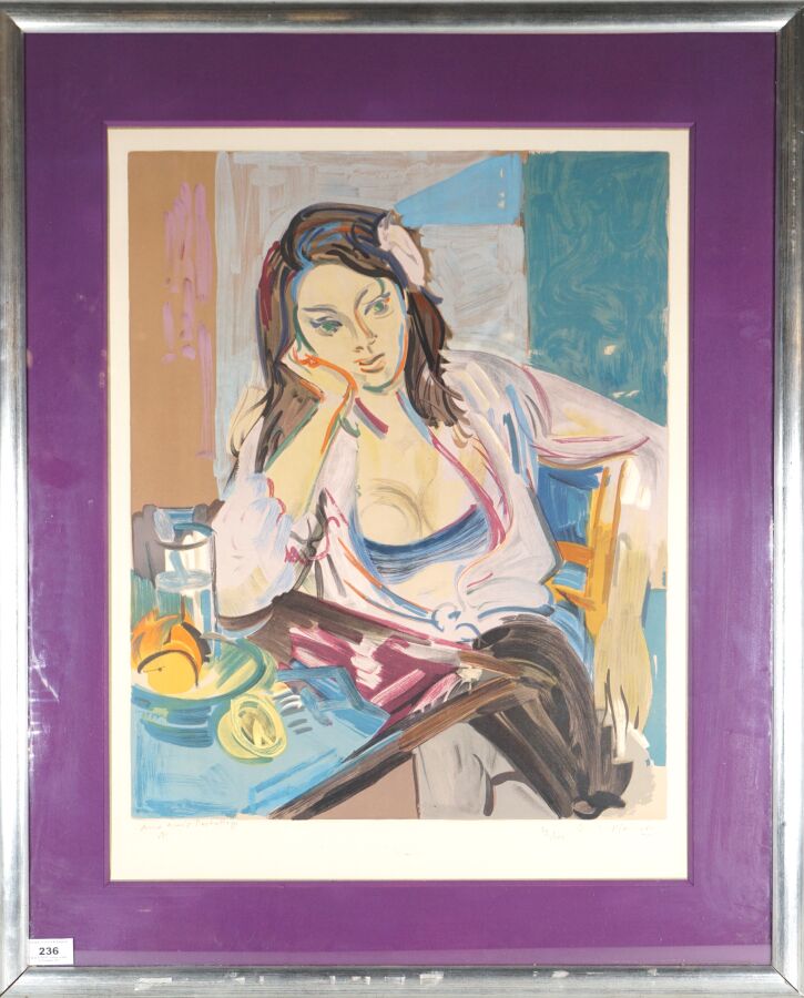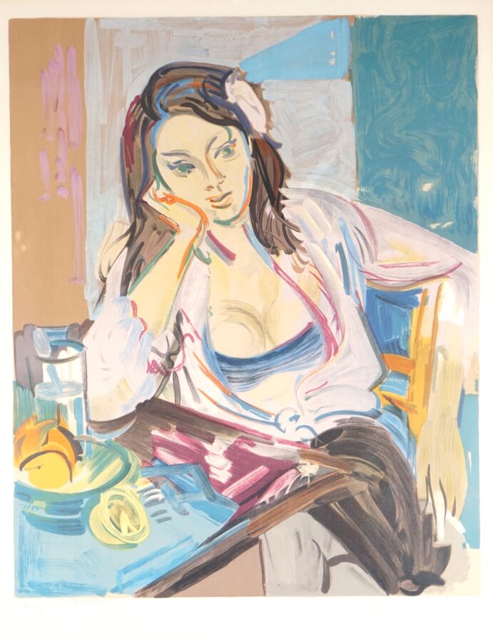 André PLANSON (1898-1981), "Femme accoudée", lithographie en couleurs, justifiée 75/100 dans la marge en bas à gauche et annotée "Aux amis Past..", signée dans la marge en bas à droite, 62 x 47 cm (à vue).