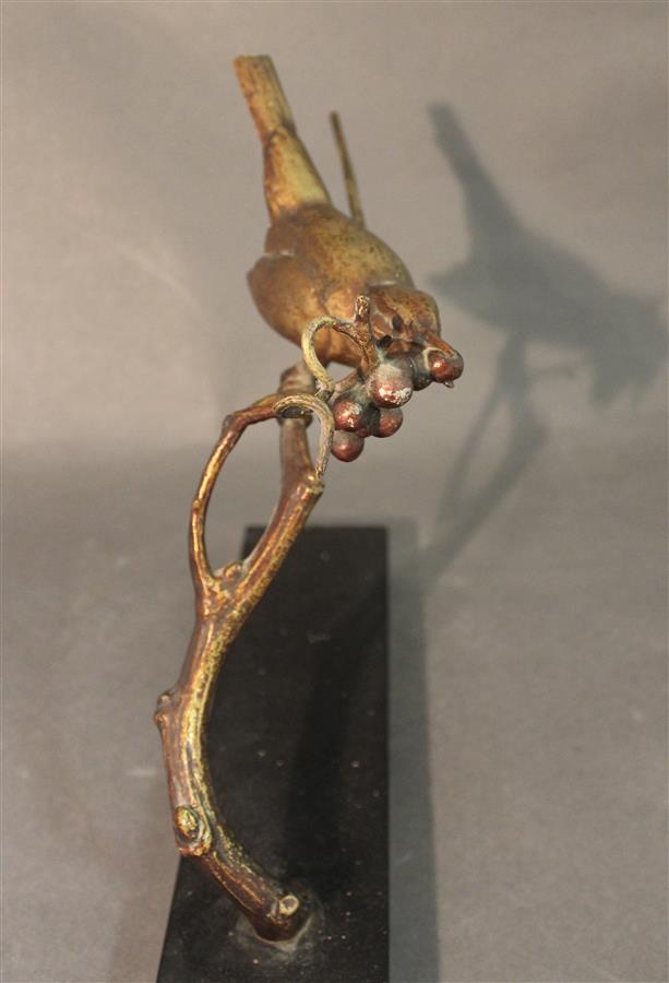 André Vincent BECQUEREL (1893-1981), "Oiseau branché saisissant des fruits", sculpture en bronze, patine dorée et rouge, socle en marbre noir, L. 26 H. 27 cm (patine rouge des grappes légèrement effacée par endroits, un petit éclat pour trois coins du marbre)