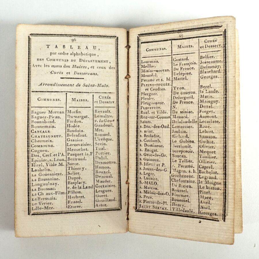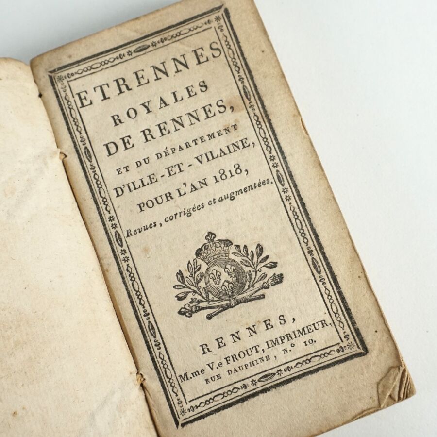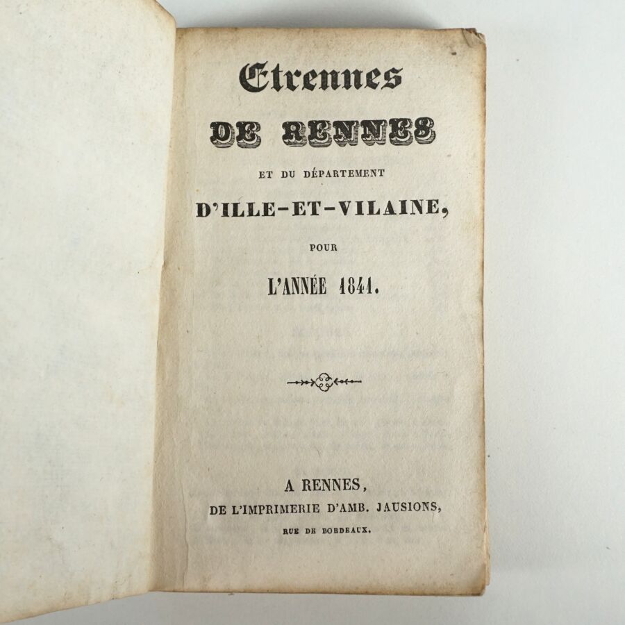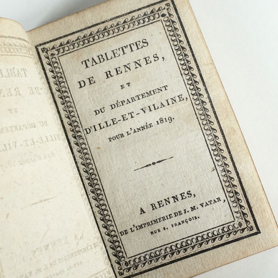 - Tablettes de Rennes et du département d'Ille-et-Vilaine, 26 vol. brochés et reliés : 1805-1806, 1808, 1809, 1810, 1811 (en 2 ex.), 1812, 1813, 1814 (en 2 ex.), 1816 (en 2 ex.), 1817, 1819, 1820, 1826, 1827 (en 2 ex.), 1828, 1829, 1830, 1831, 1832, 1833, 1834, 1845.