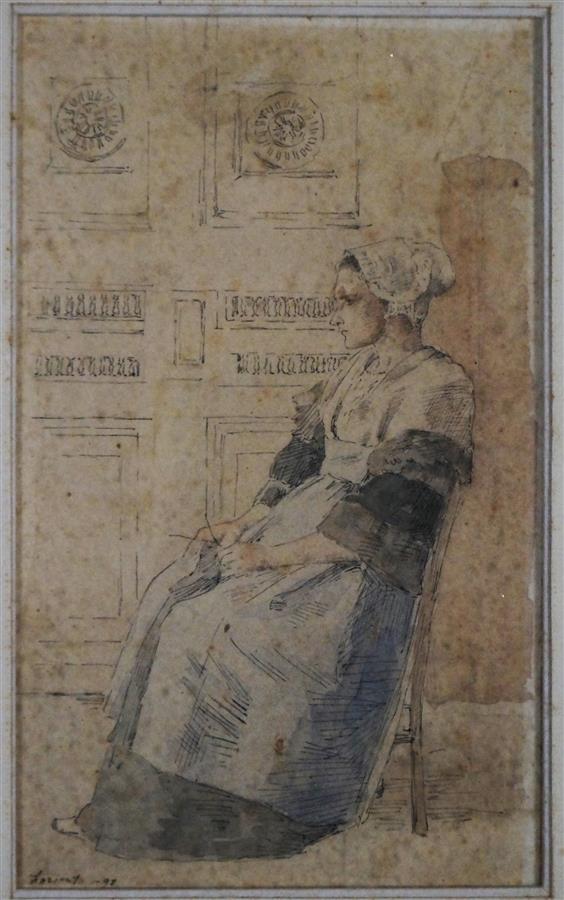 Anonyme, "Bretonnes", suite de 4 aquarelles sur papier, situées pour trois d'entre elles : Lorient, Auray et Pluvigner, 21 x 12.5 cm (à vue) (en l'état).