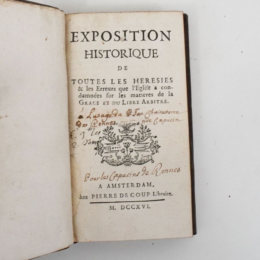 Anonyme. Exposition historique de toutes les hérésies & les erreurs que l'Eglise a condamnées sur les matières de la grâce et du libre arbitre. Amsterdam, Pierre de Coup, 1716. In-12 veau brun, dos à nerfs orné (reliure de l'époque). Frottés.