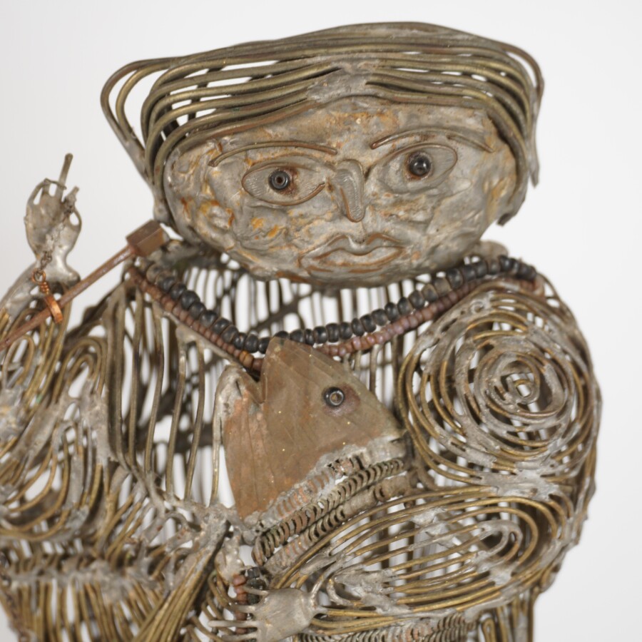 Anonyme, "Pêcheur et sa femme", deux petits sujets en métal et fil de fer, sur socle bois, H. 25 et 22 cm.