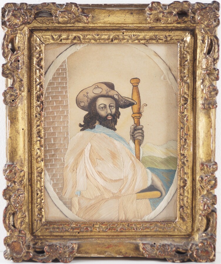 Anonyme, "Saint-Jacques", technique mixte, broderie, dessin à l'encre et aquarelle sur papier, non signé, 14.5 x 11 cm (quelques manques au cadre).