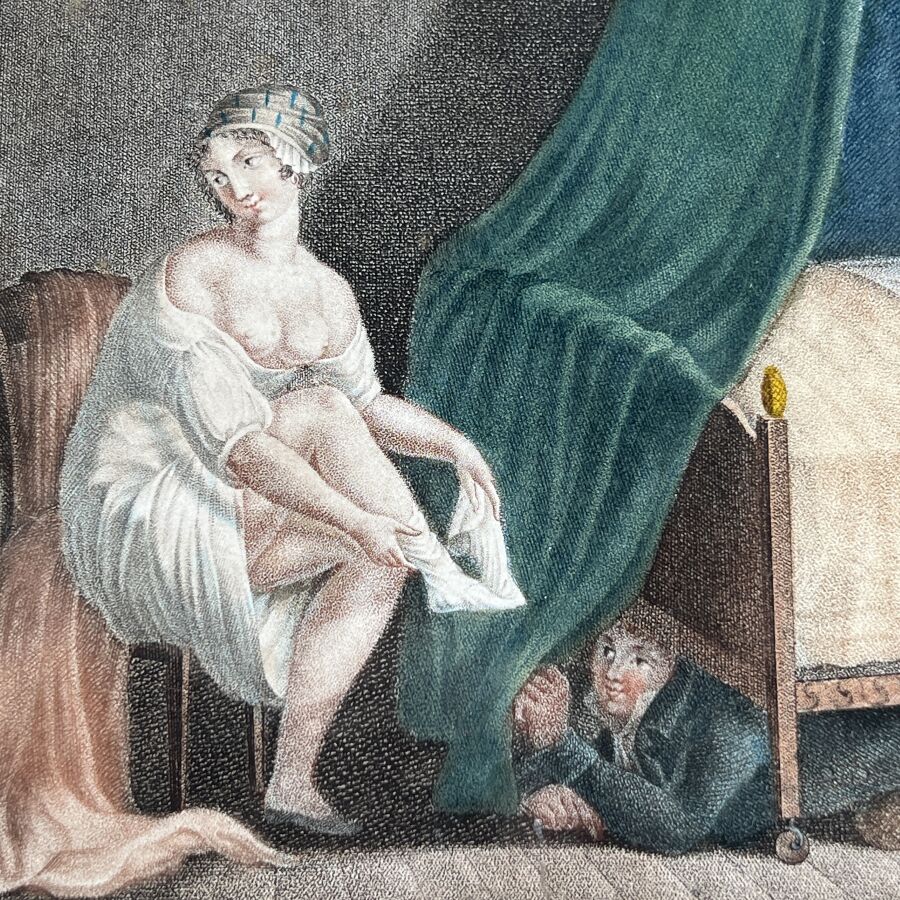 Anonyme (XIXe), "La pudeur en défaut", gravure en couleurs, 38 x 47 cm (taches).