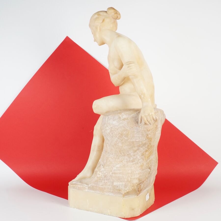 ANONYME (XXe), "Baigneuse", sculpture en albâtre, signée en creux au revers sur le rocher, H. 56 cm (petits éclats).