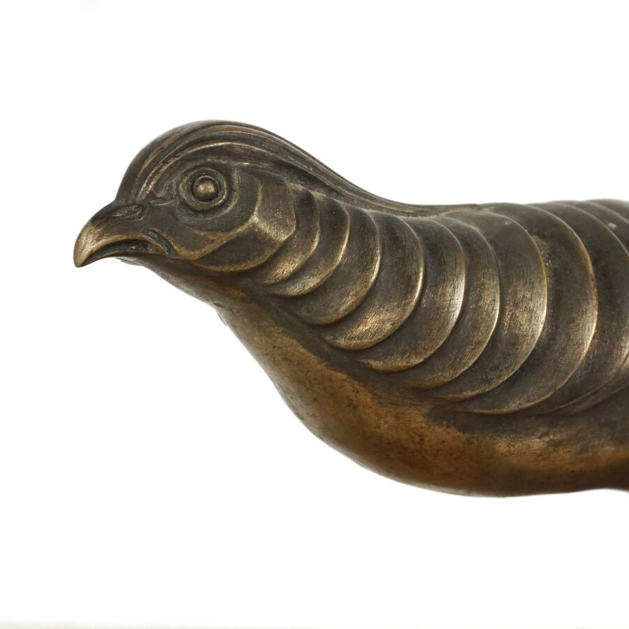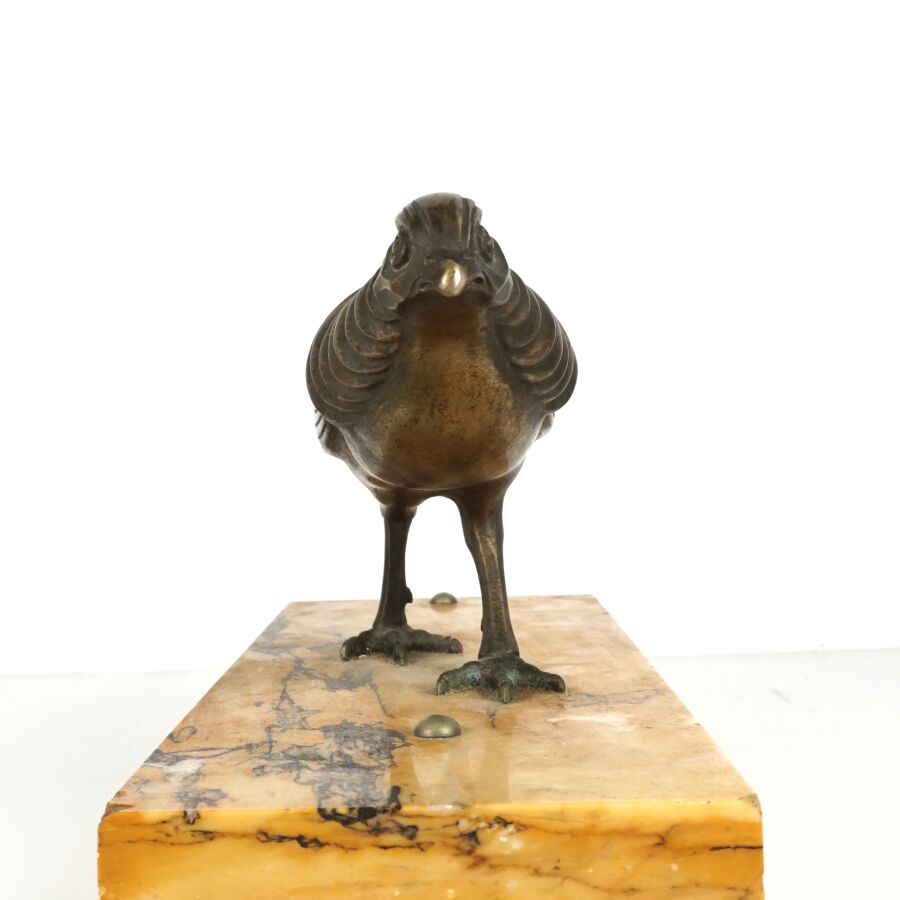 Anonyme (XXe), "Faisan au repos", sujet en bronze à patine brune reposant sur un socle en marbre jaune de Sienne, circa 1930, 62 x 14,5 cm.