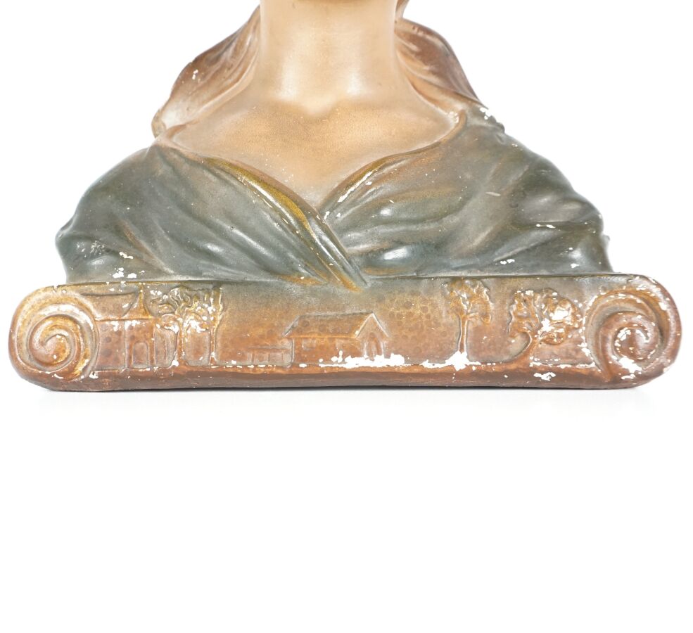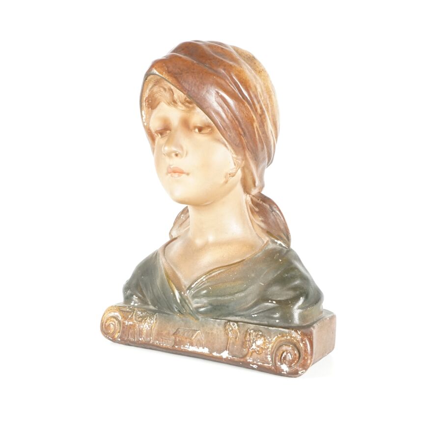 Anonyme (XXe), "Jeune femme", buste en plâtre patiné polychrome, à l'attention des Nouvelles galeries à Auray, H. 31 cm (usures et manques).