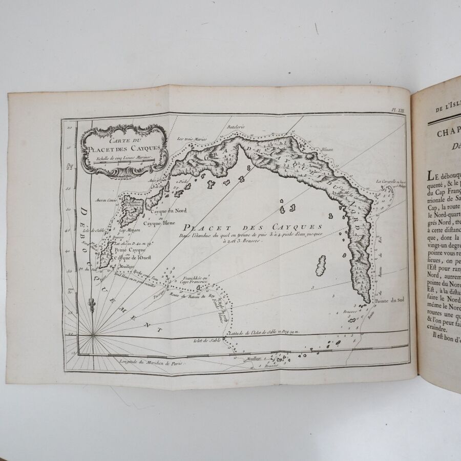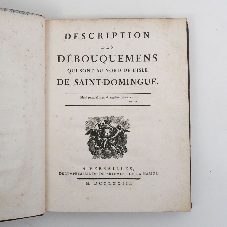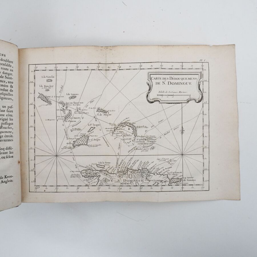 [Antilles - BELLIN (Jacques Nicolas)]. Description géographiques des débouquemens qui sont au nord de l'Isle de Saint-Domingue [avec des cartes et des plans des isles qui forment ces passages, et des dangers qui s'y trouvent. Pour le service des vaisseaux du Roy, par ordre du M. le duc de Praslin]. Versailles, de l'Imprimerie du département de la Marine, 1773. In-4 ; basane havane marbrée, dos lisse orné, pièce de titre, tranches mouchetées (reliure de l'époque).