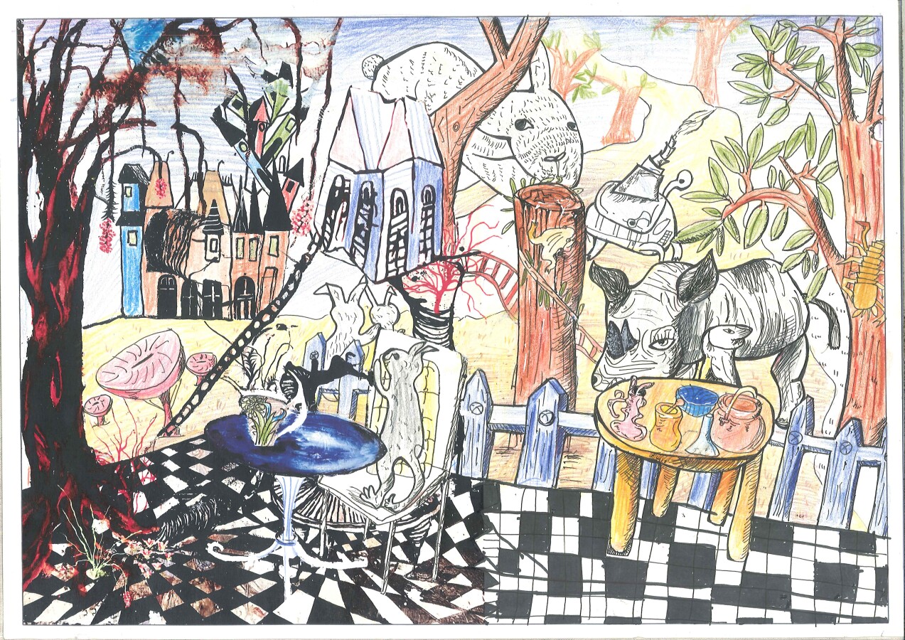 Anzhuo ZHAO, "Monde mystérieux de la jungle", dessin et aquarelle sur papier, 29.7 x 42.0 cm. * Cocréation avec Emmanuelle Renard.