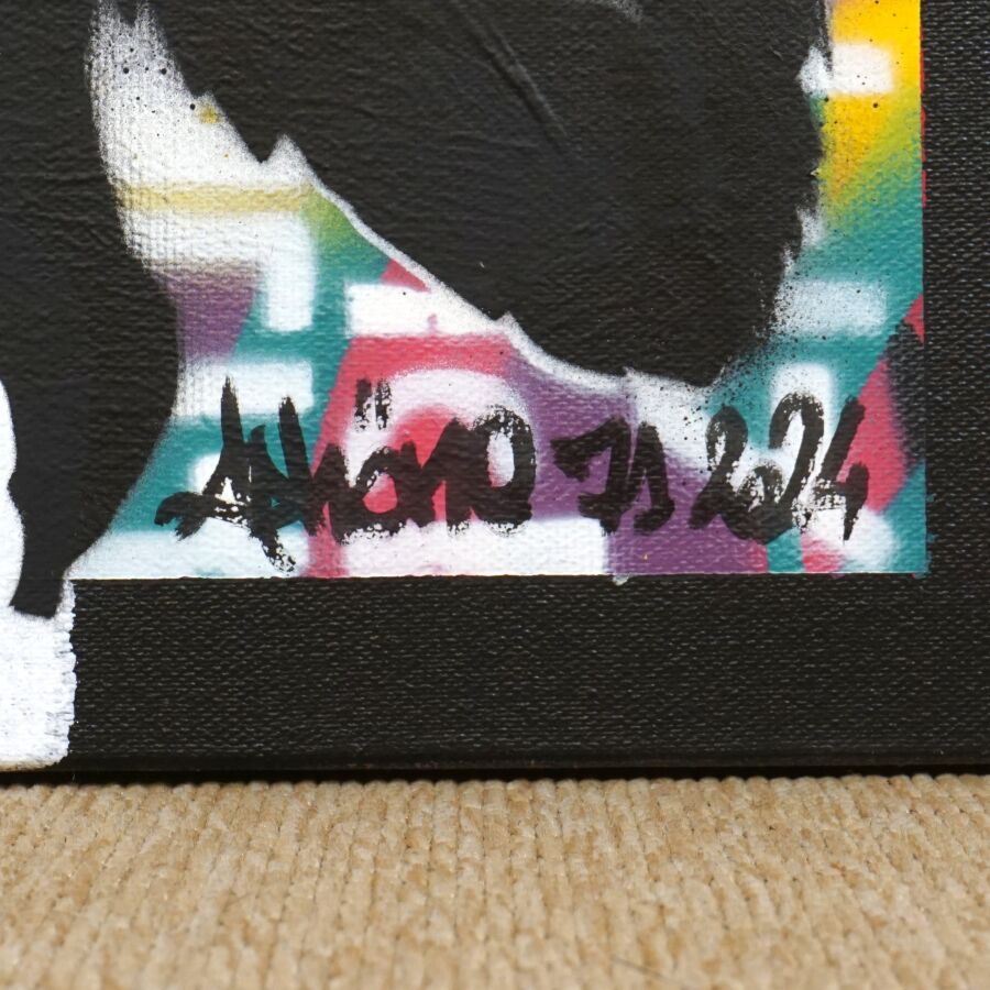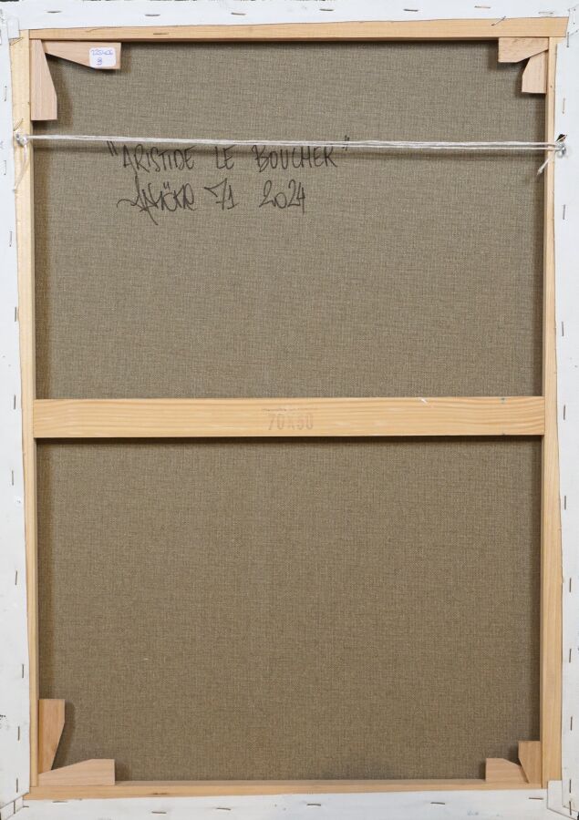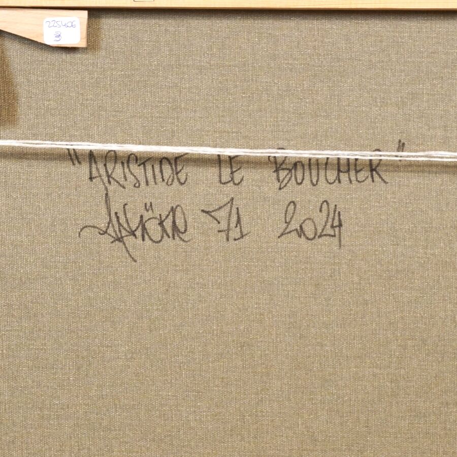 Aphöne (1986), "Aristide le boucher" 2024, technique mixte sur toile signée et datée en bas à droite, contresignée, titrée et datée au dos, 70 x 50 cm.