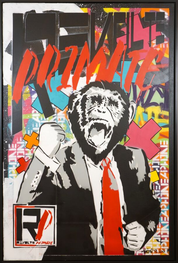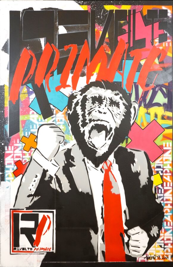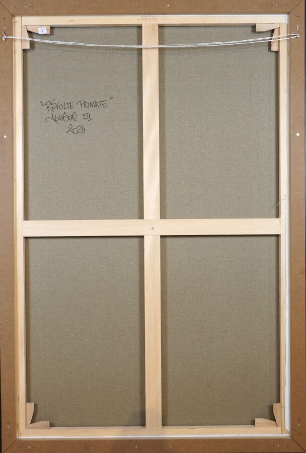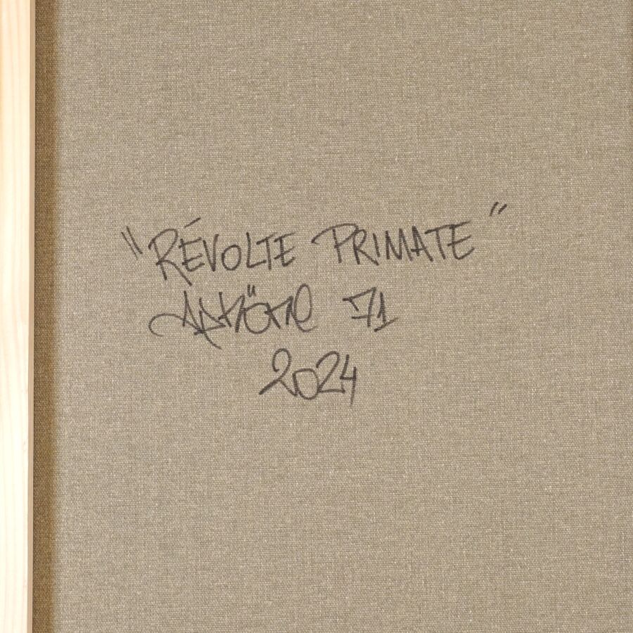 Aphöne (1986), "Révolte Primate" 2024, technique mixte sur toile signée et datée en bas droite, contresignée, titrée et datée au dos, 120 x 80 cm.