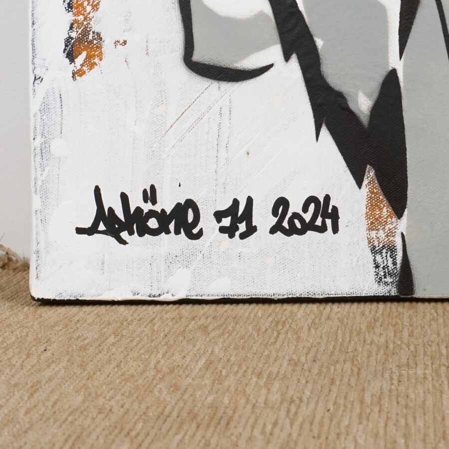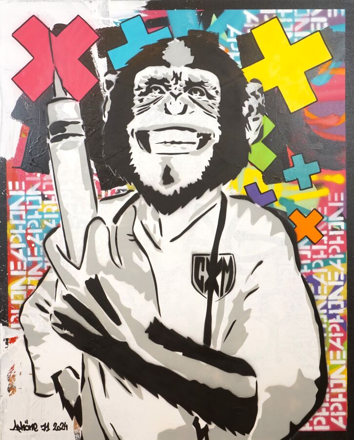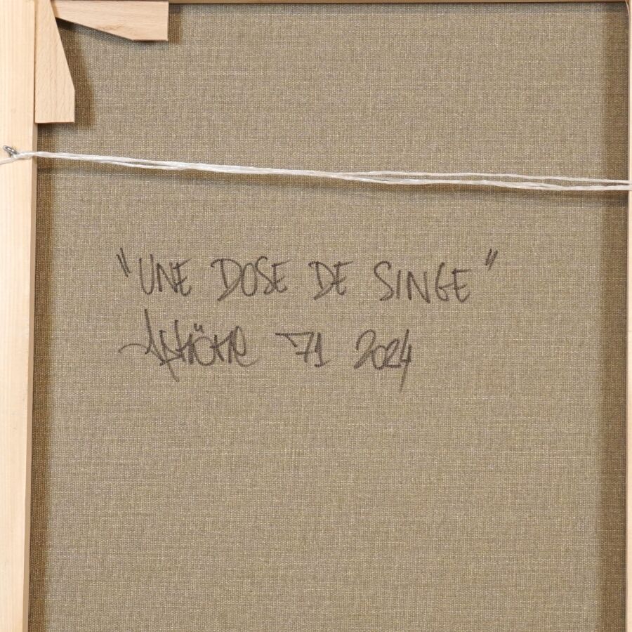 Aphöne (1986), "Une dose de singe" 2024, technique mixte sur toile signée et datée en bas à gauche, contresignée, titrée et datée au dos, 101 x 80 cm.