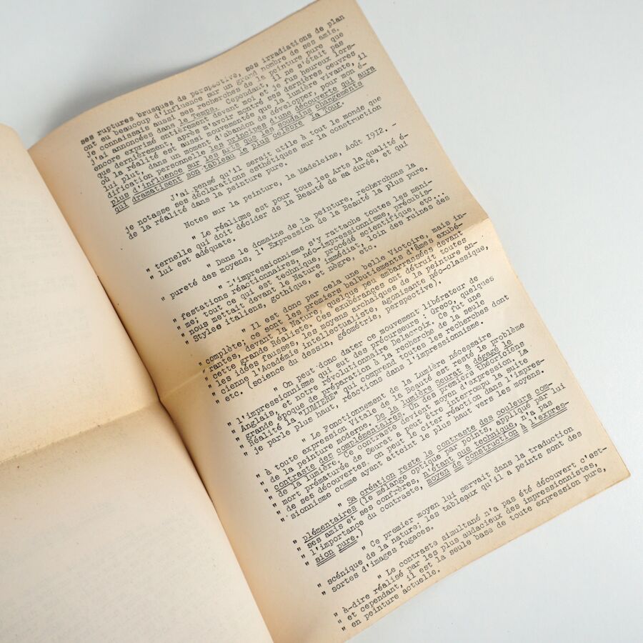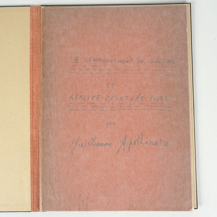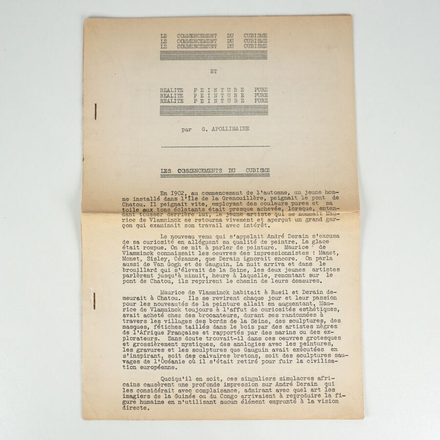 APOLLINAIRE (Guillaume). Le commencement du cubisme et réalité peinture pure. S. l. (Paris), s. d. (vers 1939). In-4 agrafé de 6 ff. dactylographiés sur un côté et plié en 2 au format in-8, sous chemise rouge portant le titre et l'auteur en fac-similé de la main de G. Apollinaire, chemise cartonnée à dos muet. Tapuscrit d'une ""conférence faite à Berlin, à propos d'une exposition, en 1912. Extrait du Journal ""Ber-Sturm."" [Der Sturm]. Traduction française sans doute due à Anatole Jakovsky. Tirage probablement très restreint.