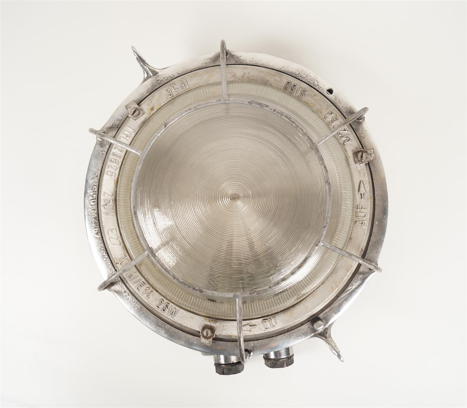 Applique/plafonnier en fonte d'aluminium, ouverture hublot, grille de protection du verre, D.26 cm.