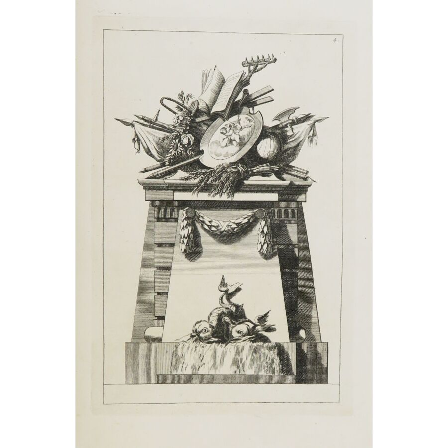 Architecture - LA FOSSE (Jean Charles de). Nouvelle iconologie historique ou attributs hiéroglyphiques composées et arrangées de manière qu'ils peuvent servir à toutes fortes de décorations. Algemeen kunstenaars handboek; of schatkamer voor alle beoefenaaren van kunsten en handwerken; bevattende een uitmuntende en talrijke verzameling van bouwkunstige versierzelen, fonteinen etc.? Amsterdam, Roos & Fokke, sd [1790]. 2 tomes en 1 volume in-folio, demi-veau blond à coins, dos à nerfs richement orné (reliure hollandaise de l'époque). [2] ff. ( y compris le titre), 39 pp. de texte en français (explication des planches) sur 2 colonnes avec traduction hollandaise au regard, 2 frontispices et 103 planches hors-texte.