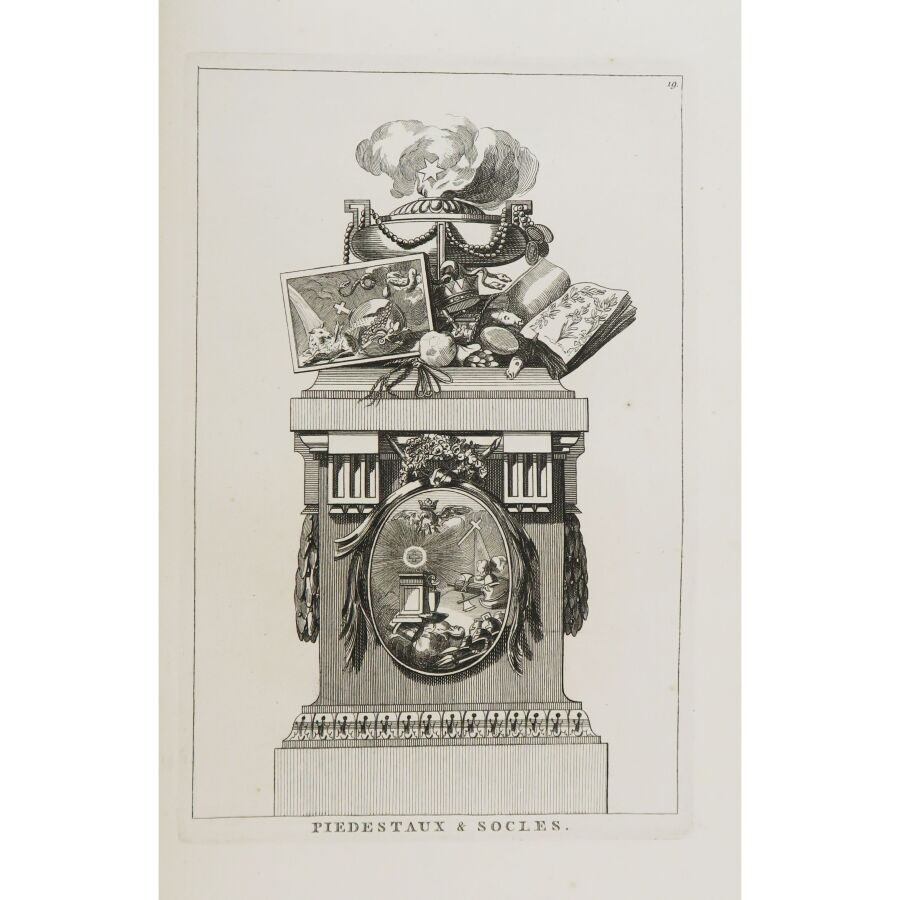 Intéressante illustration représentant des fontaines, pyramides, cheminées, dessus de porte, bordures, médaillons, trophées, vases, frises tombeaux, pendules etc.