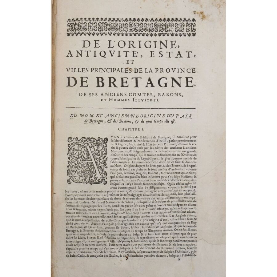 ARGENTRÉ (Bertrand d'). L'Histoire de Bretagne, des Roys, Ducs, Comtes, et Princes d'icelle ; l'établissement du Royaume, mutation de ce titre en Duché, continué jusqu'au temps de Madame Anne derniere Duchesse, & depuis Reyne de France, par le mariage de laquelle passa le Duché en la Maison de France [...] Rennes, Jean Vatar et Julien Ferré, 1668. In-folio basane brune, dos à nerfs orné de fers héraldiques aux armes de Bretagne et fleurs de lys, titre doré (reliure de l'époque). Reliure très usagée, restaurée. Mouillures marginales. Le dernier feuillet de table est ici en fac-similé. Ex-libris Jean Guégau.