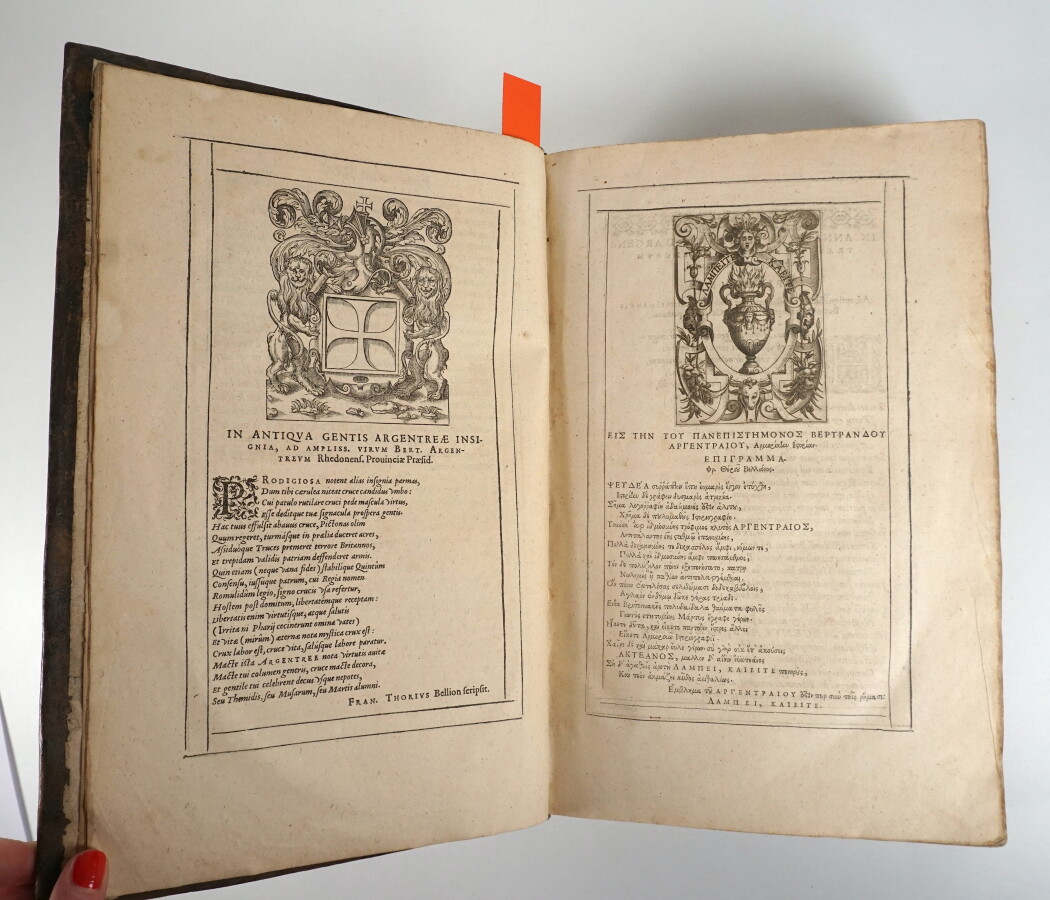 ARGENTRÉ (Bertrand d') - L'histoire de Bretaigne des Roys, Ducs, Comtes, et Princes d'icelle : L'establissement du Royaume, mutation de ce tiltre en Duché, continuité jusques au tems de Madame Anne derniere Duchesse, & depuis Royne de France, par le mariage de laquelle passa le Duché en la maison de France [] - Paris ; Jacques du Puys, 1588 - 1 fort volume In-folio - [20], 1160 pages mal chiffrées 1174 - Quelques feuillets jaunis, quelques cernes en marge supérieure, annotations au dernier contre plat - Titre gravé sur bois, 2 vignettes gravées in texte, carte et tableau généalogique manquants - Reliure légèrement postérieure veau brun moucheté (2 légèrement émoussés, 1 début de fente en haut du 2nd mors) - Dos à nerfs titré or et orné des armes des états de Bretagne et de fleurs de lys (coiffe supérieure manquante avec manque au 1er caisson) - Tranches mouchetées de rouge - Rare et importante 2nde édition de cette célèbre chronique. Brunet (I, 419) précise qu'une 1ère édition a commencé à être éditée à Rennes en 1582 mais qu'après avoir été " vu, retranché et corrigé par certains commissaires ", ce livre fut à nouveau imprimé à Paris en 1588. Kerviler indique (Tome I page 261) que la 1ère édition contient 1174 pages et que la 2nde de 1588 en contient 832 suite à la suppression de certains passages incriminés comme trop bretons depuis l'union de la Bretagne à la France, notre exemplaire a néanmoins conservé l'intégralité de son texte et la présente édition est la 1ère à avoir été réellement diffusée.