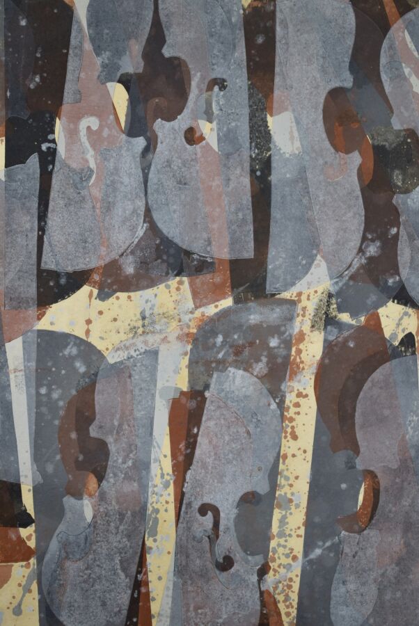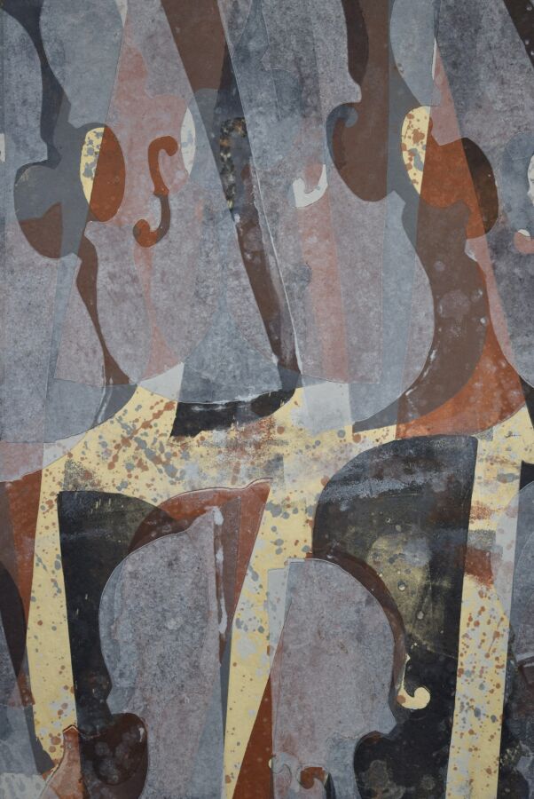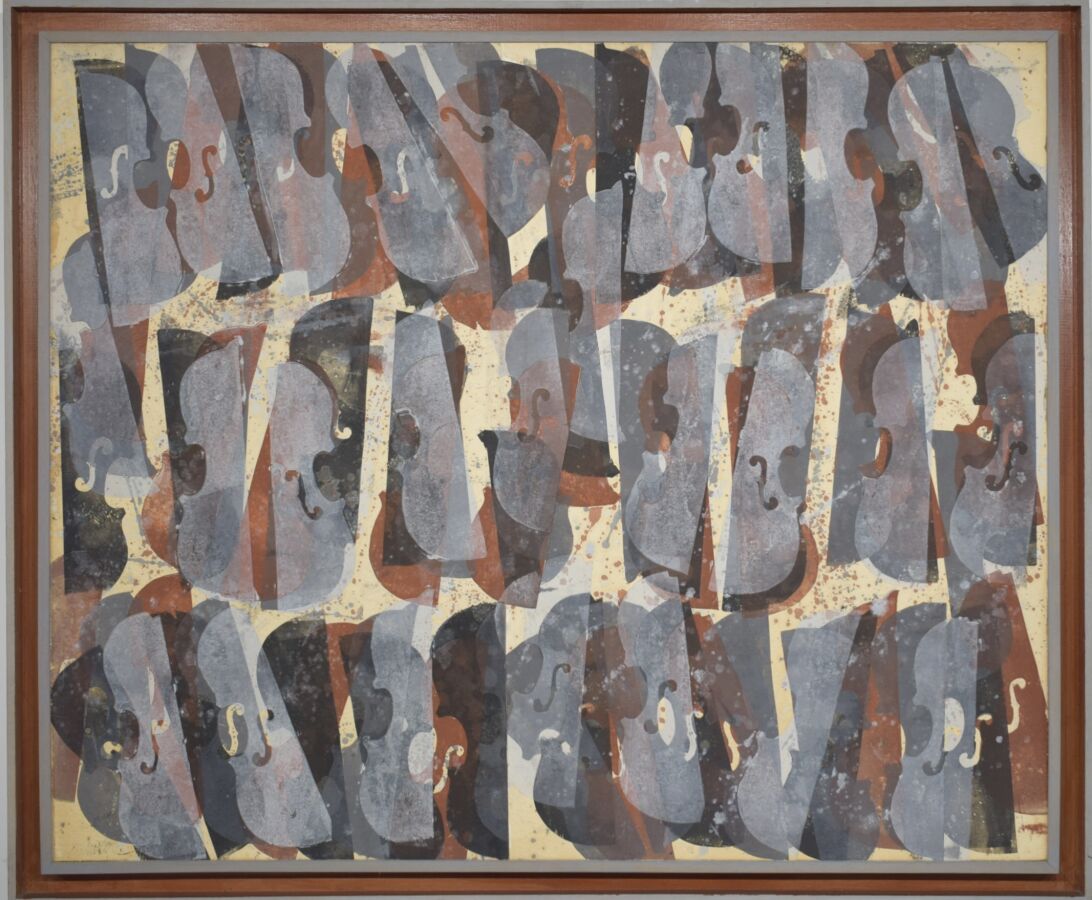 ARMAN (1928-2005), "Suite de violons", 1985, technique mixte, signé et daté en bas à gauche, tampon au revers "Galerie Ferrero", 98 x 119 cm (manques, décollements)