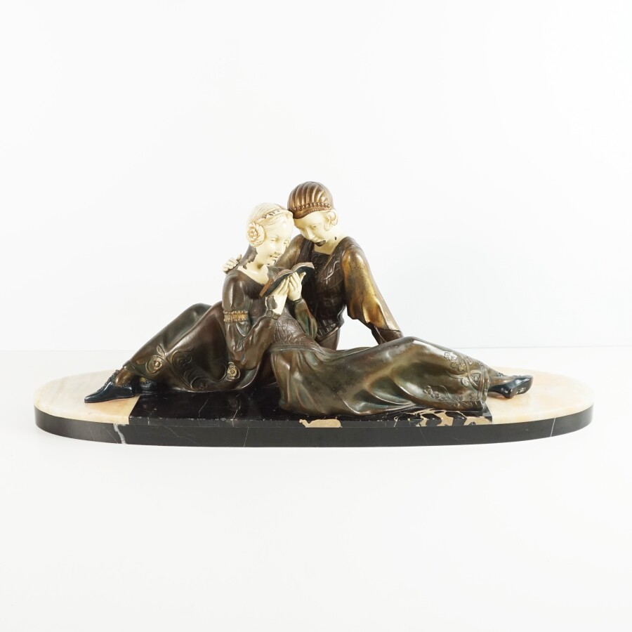 Armand GODARD (XIX-XXe), "La liseuse" circa 1930, groupe en bronze et rehauts d'émail façon chryséléphantine, terrasse en marbre et onyx, signé, 53 x 25 x 16 cm.