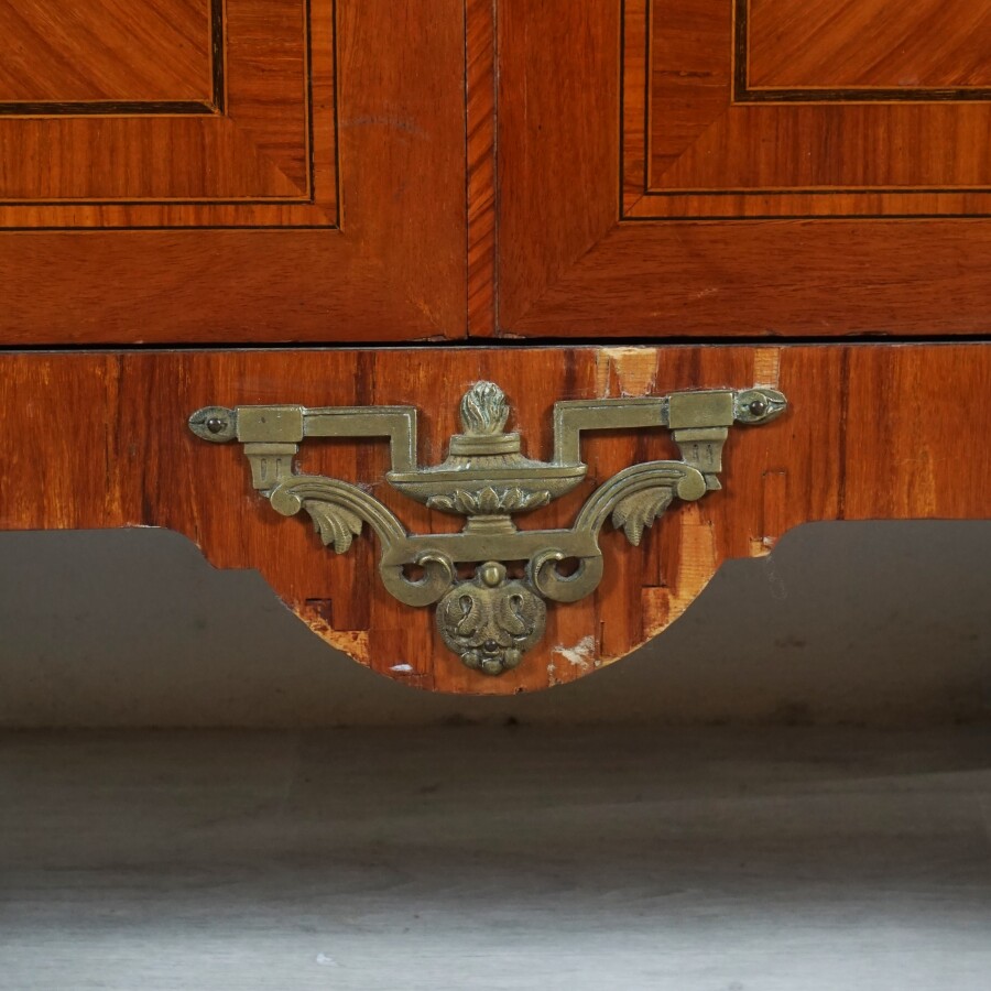 Armoire basse, bois de placage, ouvrant à deux portes en façade, coiffée d'un marbre rouge veiné blanc, style Louis XVI, H. Totale : 159.5 cm x L. 103 cm (petites usures, sauts au placage, avec sa clé).