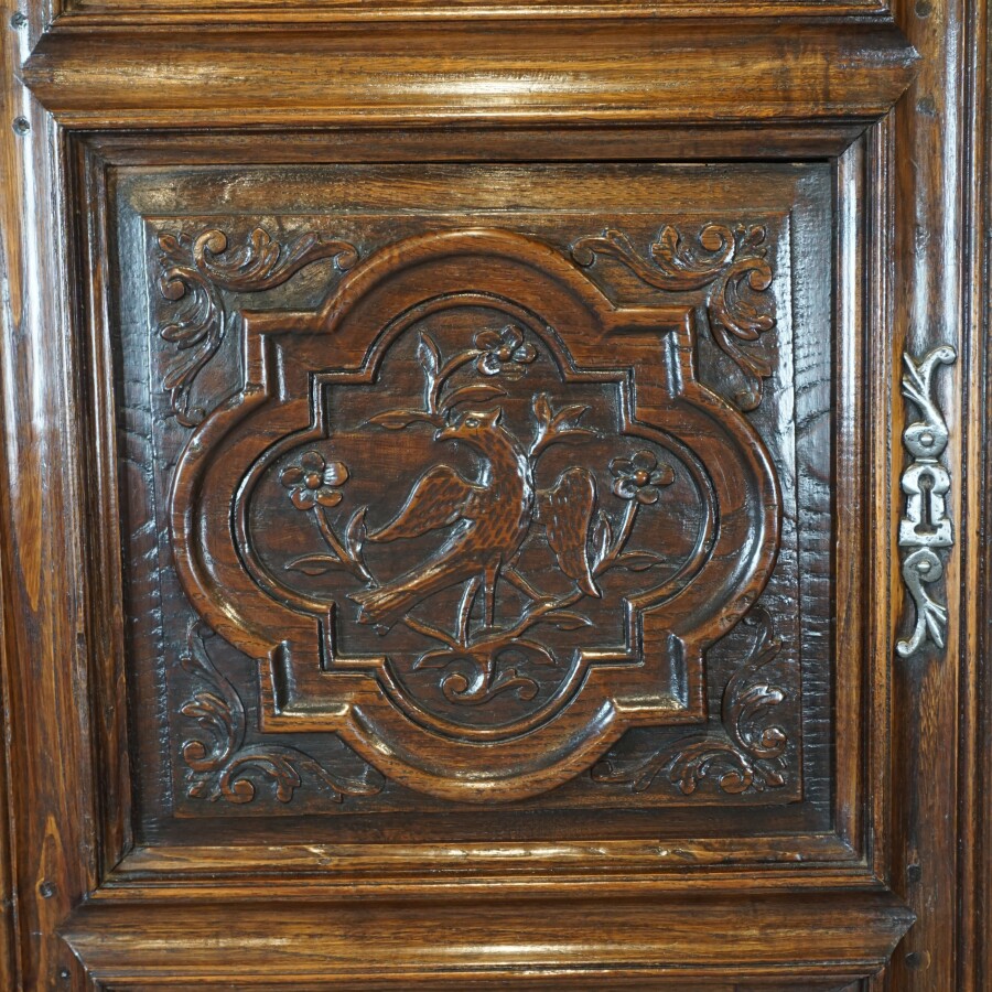 Armoire bretonne, probablement en merisier, ouvrant à deux portes sculptées à décor d'entrelacs et d'oiseaux, reposant sur 4 pieds dont 2 boules pour les pieds antérieurs, corniche à décor de créneaux, Ille et Vilaine, travail régional, H. 200 x 150 x 53 cm (avec sa clé).