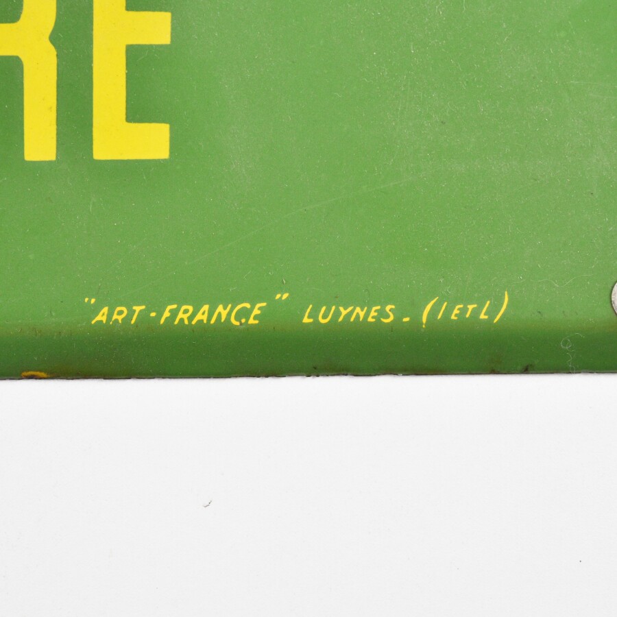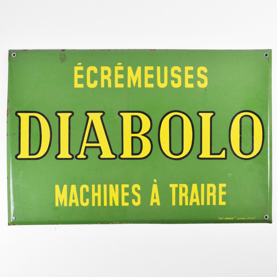 ART FRANCE - LUYNES : Plaque émaillée rectangulaire verte, inscription jaune "écrémeuses Diabolo machines à traire", 39.5 x 59.5 cm (usures).