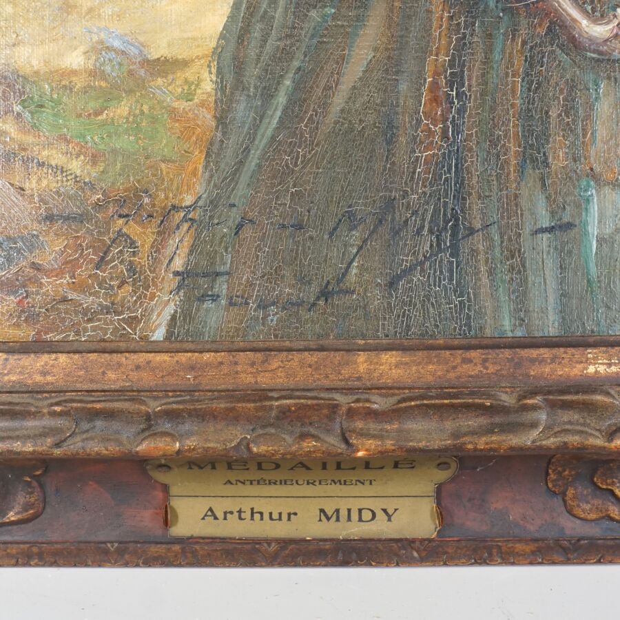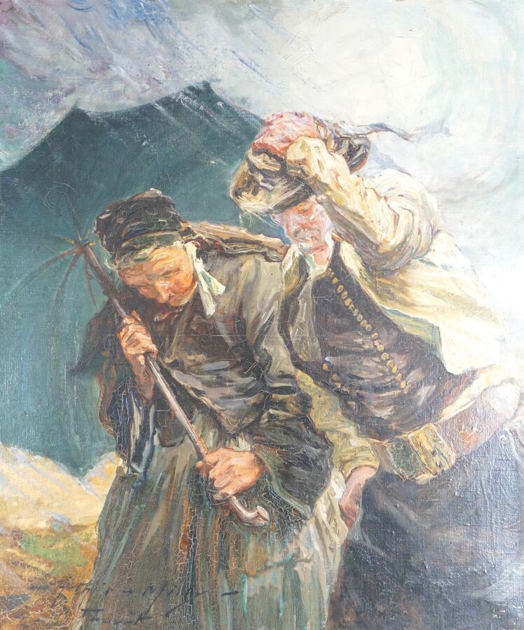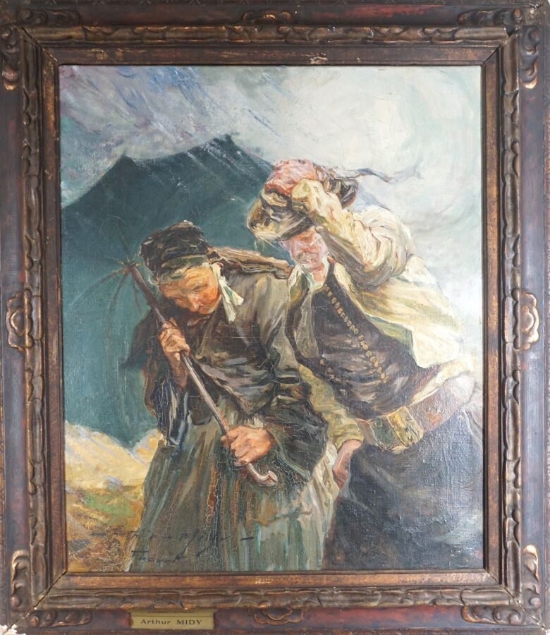 Arthur MIDY (1887-1944), "Couple de bretons dans la tempête au Faouët", huile sur toile signée et située en bas à gauche, 55 x 46 cm.