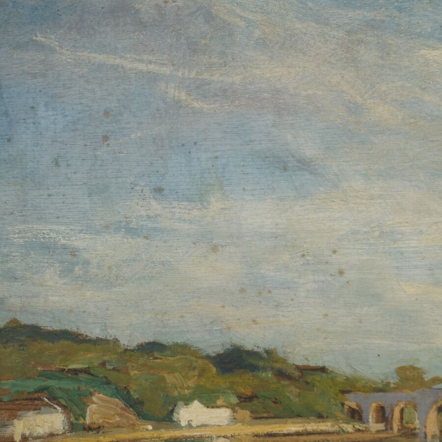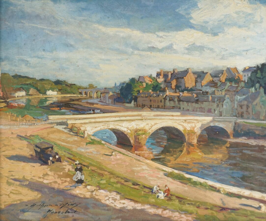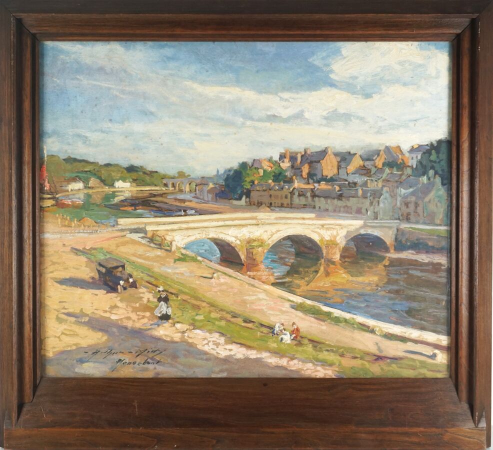Arthur MIDY (1887-1944), "Hennebont", huile sur panneau signée et située en bas à gauche, Dim. 50 x 61 cm.