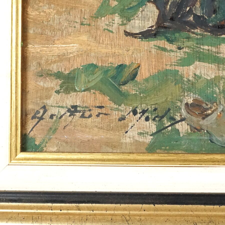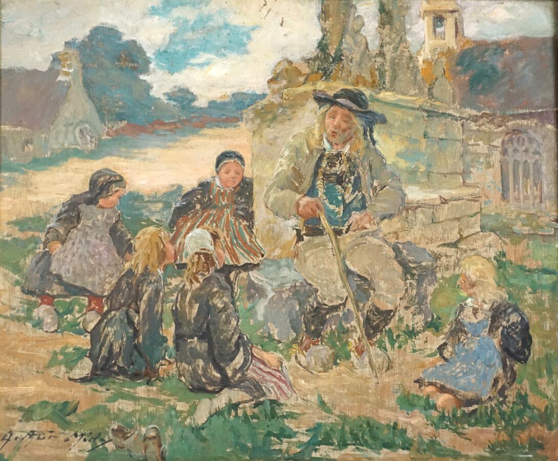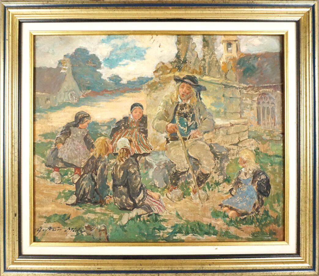 Arthur MIDY (1887-1944), "Le conteur d'histoire", huile sur panneau signée en bas à gauche, 38 x 46 cm.
