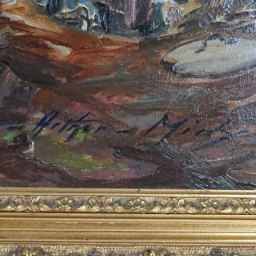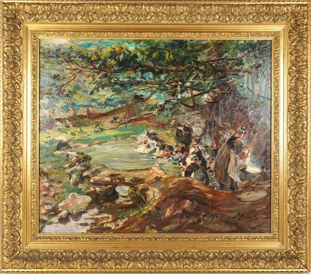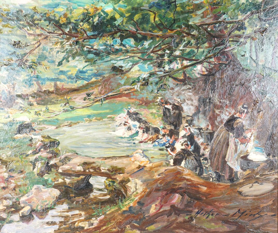Arthur MIDY (1887-1944), "Les lavandières", huile sur carton signée en bas à droite, 46 x 55 cm.