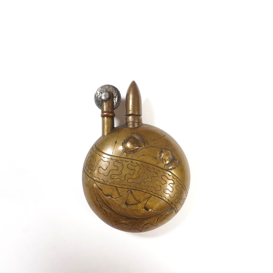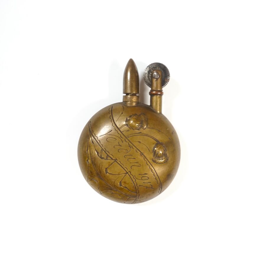 ARTISANAT DE TRANCHEE - BRIQUET CIRCULAIRE, en laiton à décor gravé et travaillé au repoussé marqué " Verdun 1917 ", mécanisme fonctionnel, petit bouchon réalisée à partir d'une balle, 48 mm de diamètre, TBE.