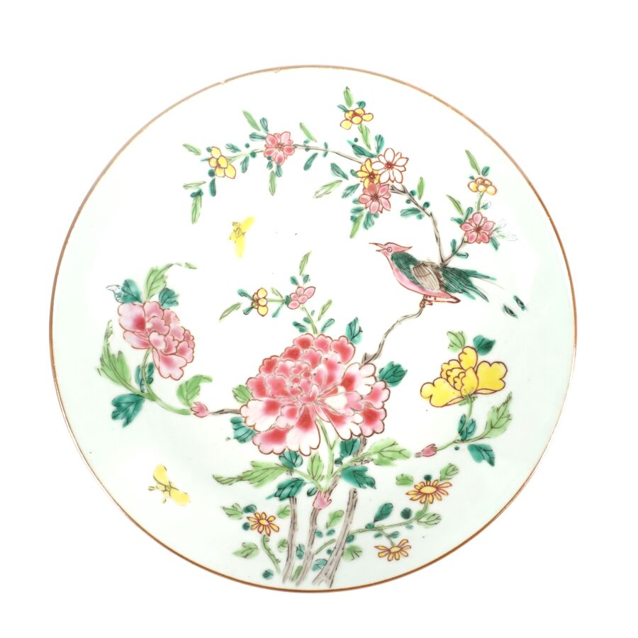 Assiette en porcelaine et émaux polychromes à décor d'oiseaux branchés, Chine, 18ème siècle, D. 21.5 cm.