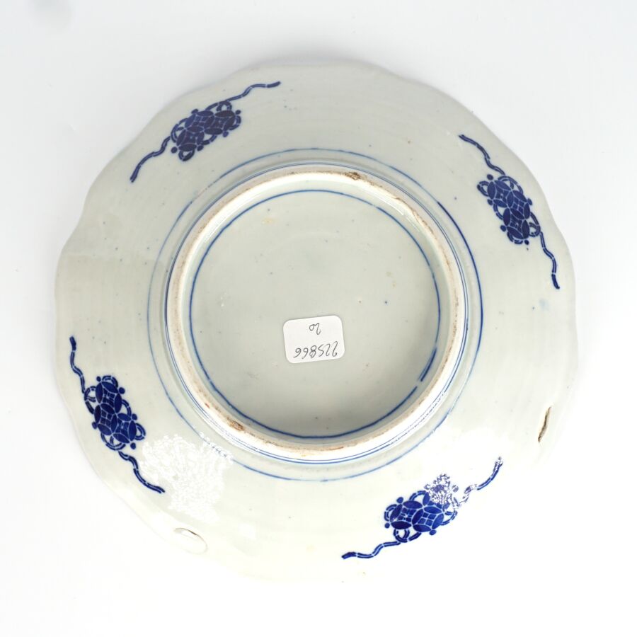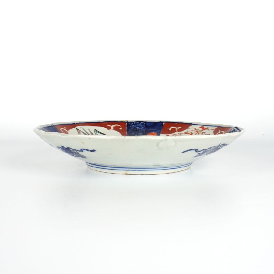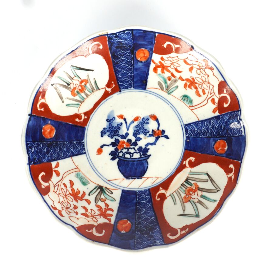 Assiette floriforme en porcelaine émaillée dite Imari à décor dans le basson d'un panier fleuri, Japon, début du 20ème siècle, D. 21.5 cm.
