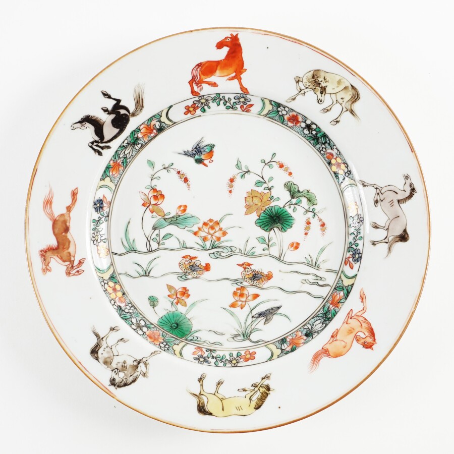 Assiette, porcelaine et émaux de la famille verte, finement décoré d'un couple de canards mandarins parmi des lotus, l'aile ornée des huit chevaux, Chine, période Kangxi, début du 18ème siècle, Diam : 22 cm (fond étoilé).