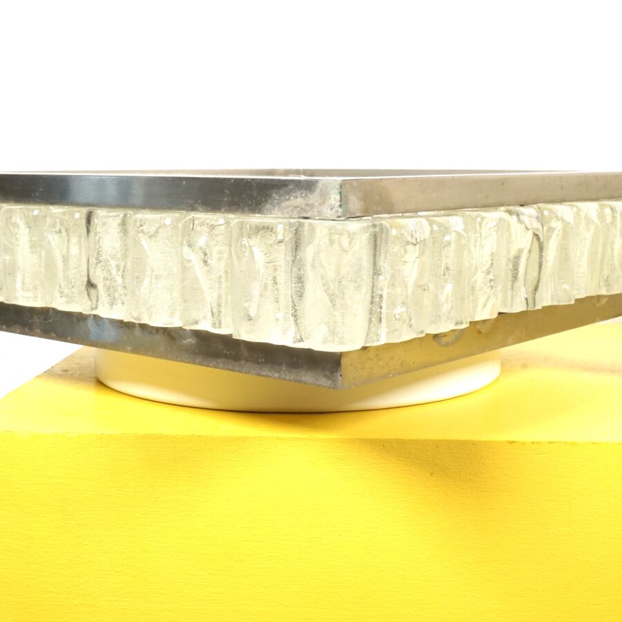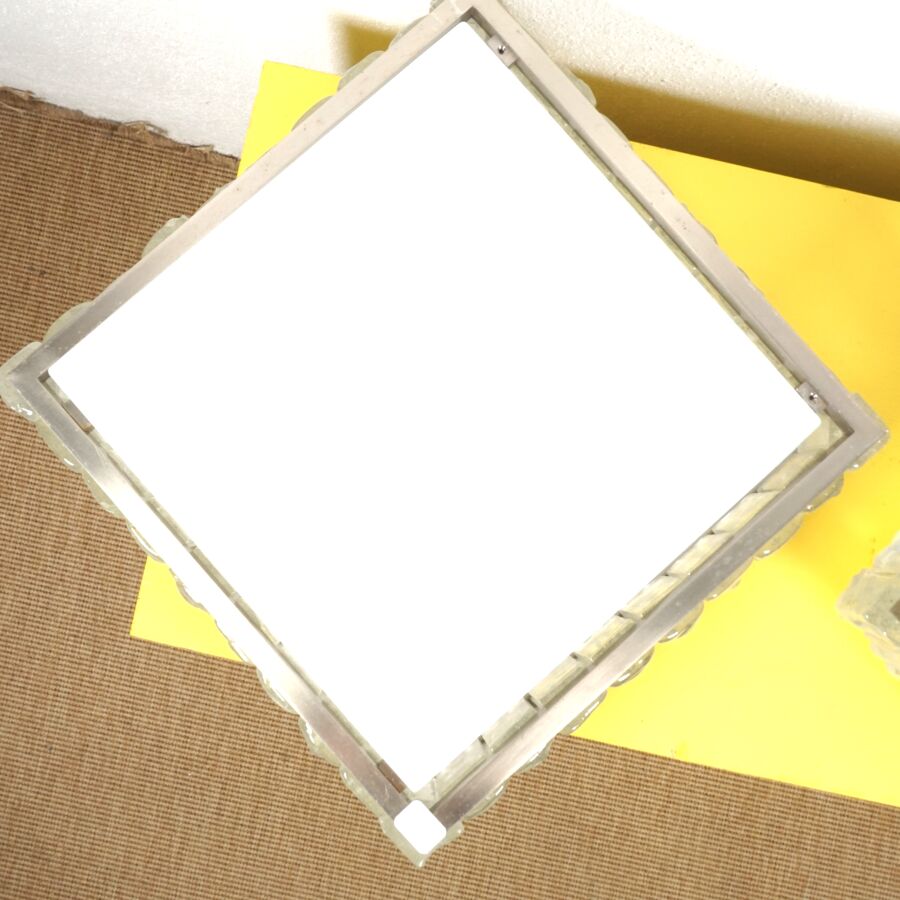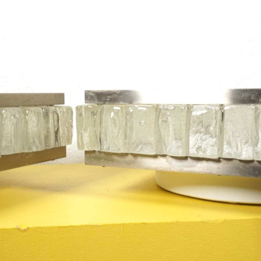 Atelier Jean PERZEL (1892-1986) : Paire de plafonniers de forme carrée, modèle "2060 A", monture en bronze et frise en verre blanc, déflecteur en verre dépoli blanc, 11.8 x 31.2 x 31.5 cm (petites usures d'usage, un cache en verre cassé).