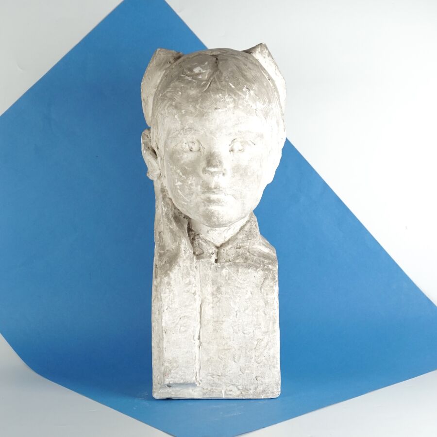 Attribué à Armel BEAUFILS (1882-1952), "Buste de jeune fille à la coiffe", sculpture en plâtre, non signée, H. 44 cm (manques et usures, accidents au socle).
