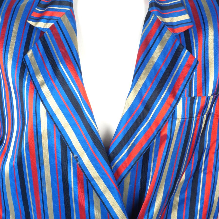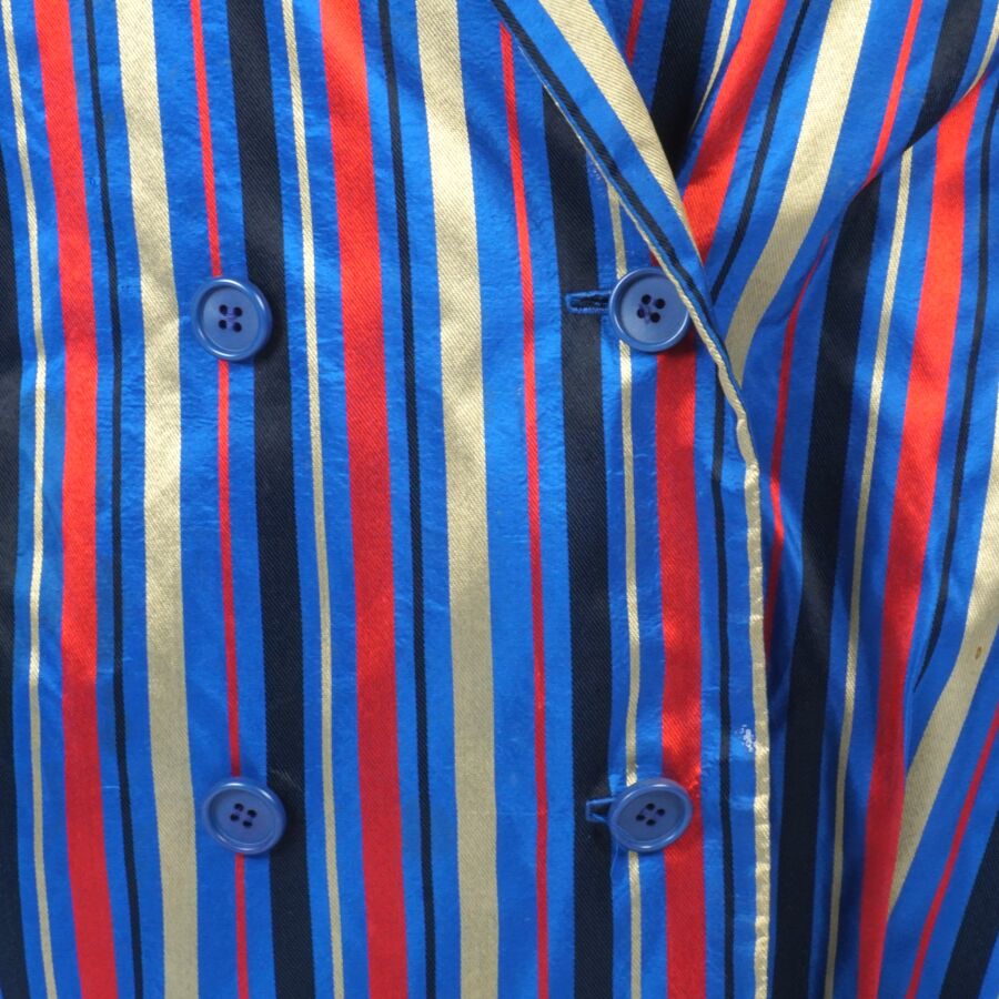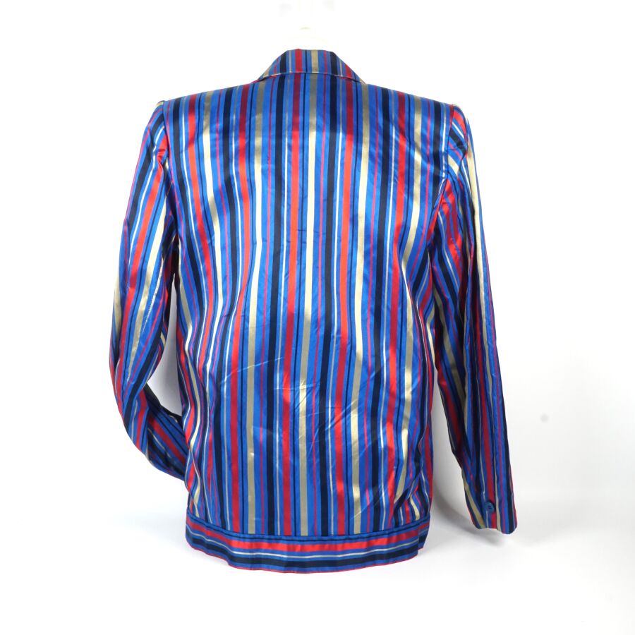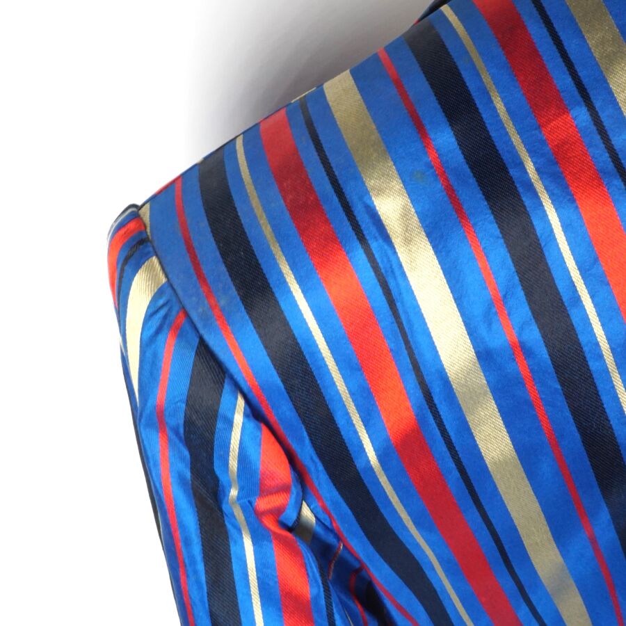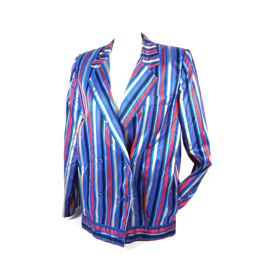 Attribué à CHRISTIAN LACROIX : Veste blazer à motif rayé rouge, noir et doré sur fond bleu azur, col dit tailleur, fermeture à l'avant par deux boutons, bouton en partie basse, manches longues fermant à un bouton aux extrémités, petite poche latérale haute, doublure bleue, sans étiquette, L. Totale : 72 cm (traces, petits fils tirés, trou dans la doublure).