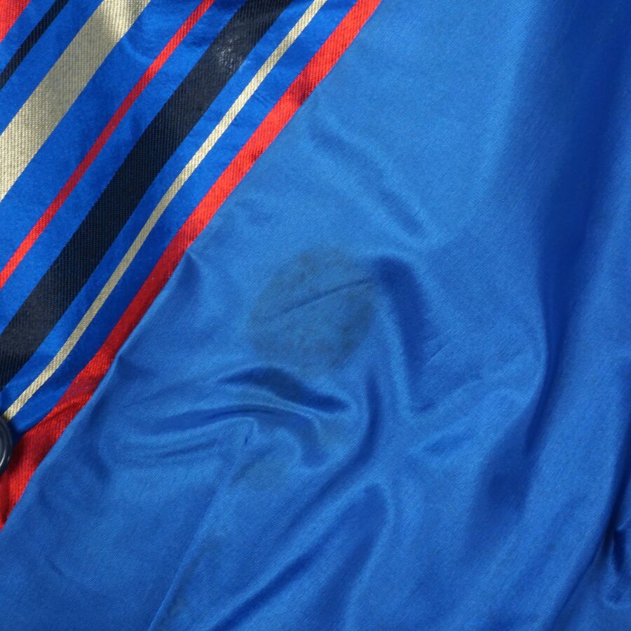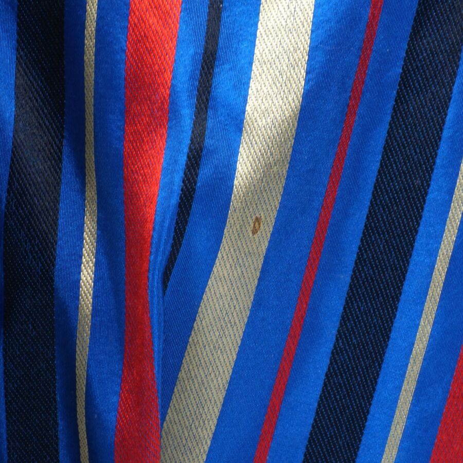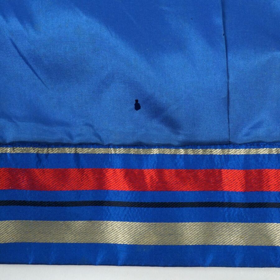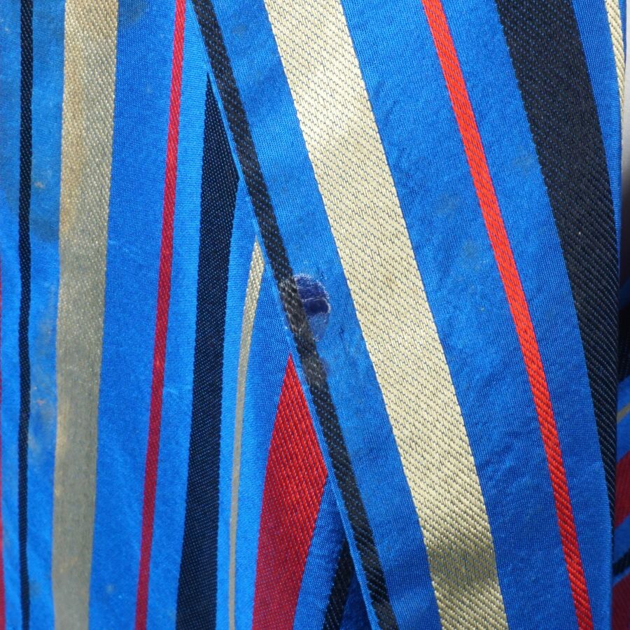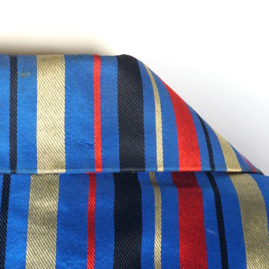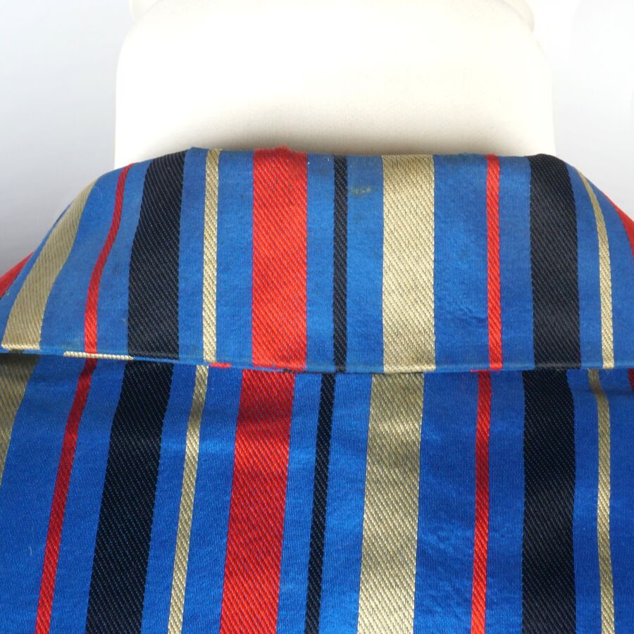 Attribué à CHRISTIAN LACROIX : Veste blazer à motif rayé rouge, noir et doré sur fond bleu azur, col dit tailleur, fermeture à l'avant par deux boutons, bouton en partie basse, manches longues fermant à un bouton aux extrémités, petite poche latérale haute, doublure bleue, sans étiquette, L. Totale : 72 cm (traces, petits fils tirés, trou dans la doublure).