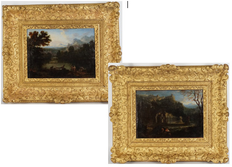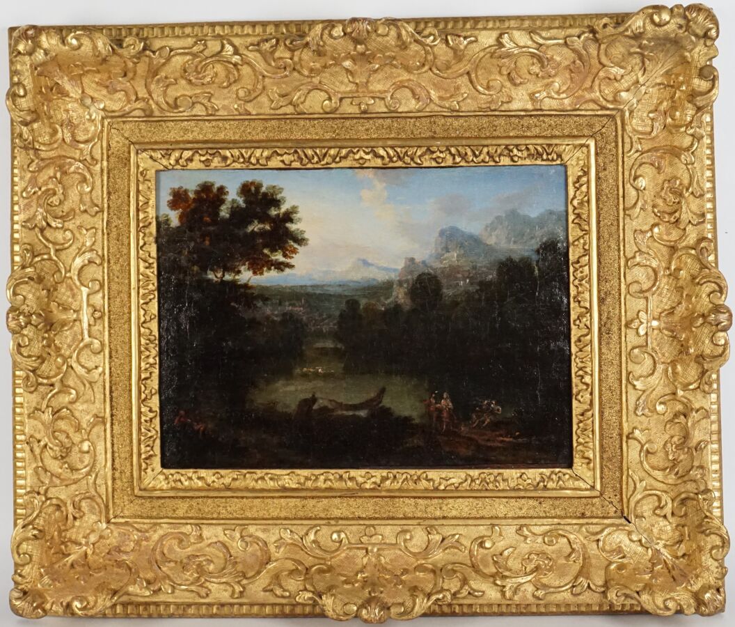 On y joint un paysage dans le gout de Allegrain, plus tardif, 25.5 x 34 cm.