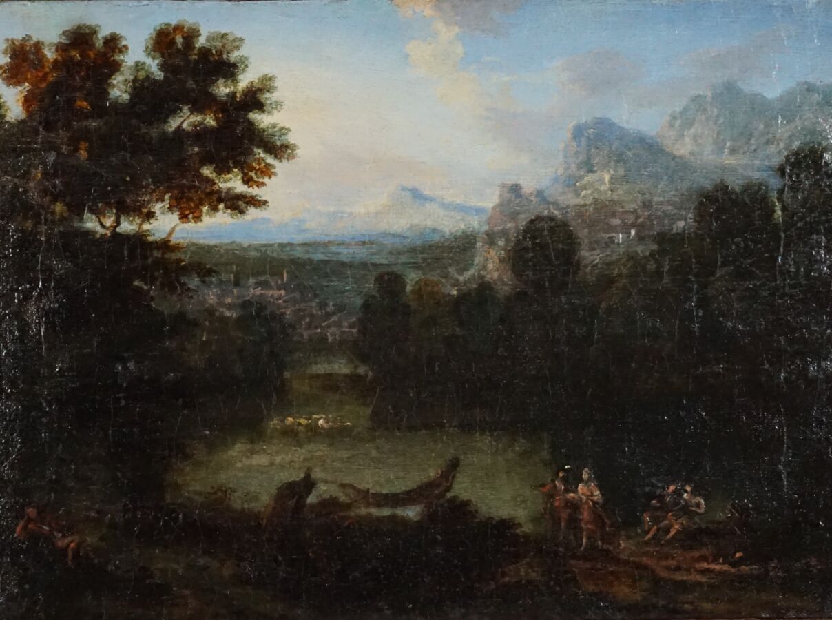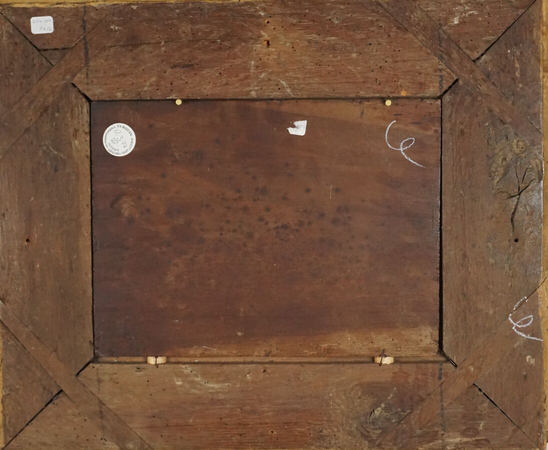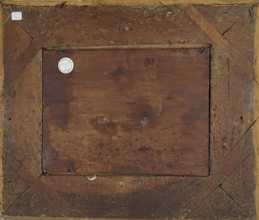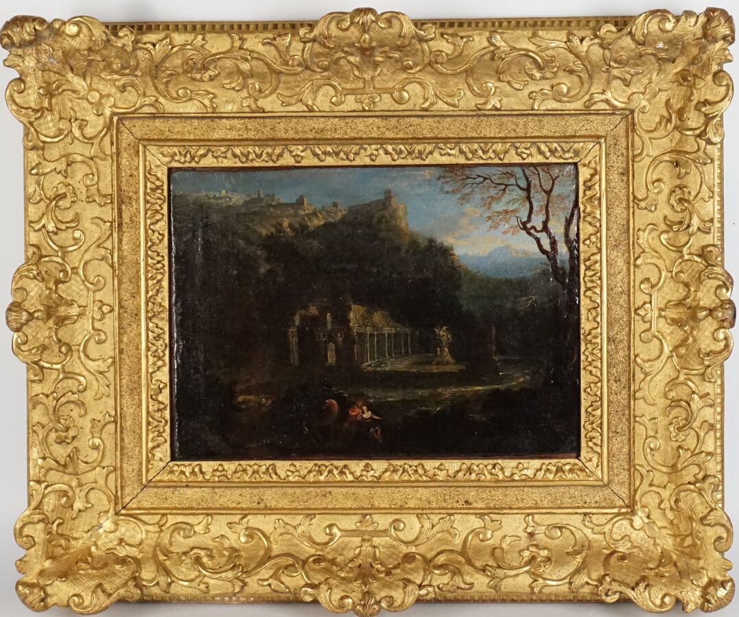 Attribué à Etienne ALLEGRAIN (1653 - 1736), "Personnages près d'une fontaine", toile marouflée sur panneau de noyer, présentée dans un cadre en bois sculpté et redoré d'époque Louis XIV, H. 25.5 cm. Larg. 34 cm (restaurations anciennes, manques, griffures).