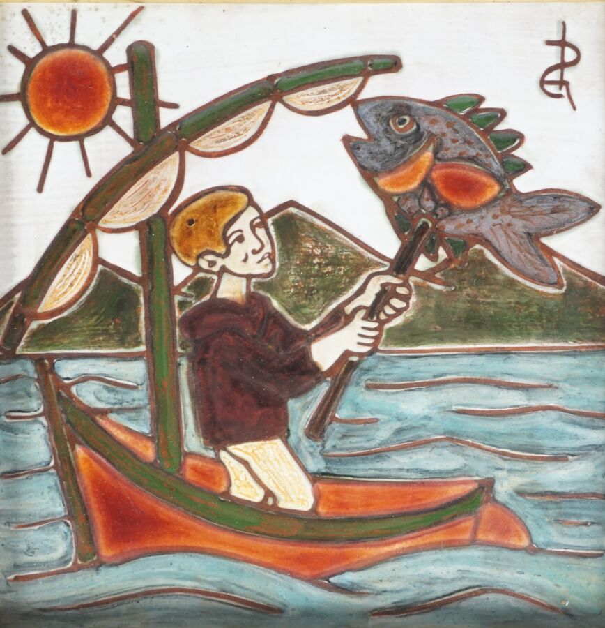 Attribué à Jacques POUSSINES (XXe), "Pêcheur", carreau de céramique émaillée, signée du monogramme de l'artiste en haut à droite, 20 x 20 cm.